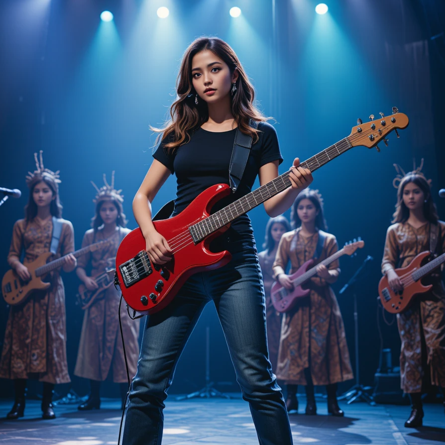 soprano female vocal, glam pop, acoustic drum, electric guitar, electric melody guitar, electric bass guitar, keyboard, Indonesian Language