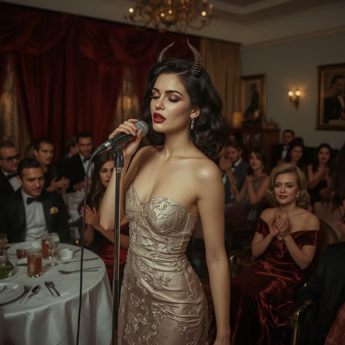 The track opens with ethereal synths and gentle piano, soon joined by lush strings and a clear, seductive, and smoky female vocals, electric guitar enter with crisp, melodic riffs, blending seamlessly with cool jazz band textures and layered choral backing, The verses carry a driving rhythm with seductive jazz sensibility, rising into uplifting, anthemic choruses, The midsection shifts into a cinematic bridge with orchestral swells and choral accents, building tension before exploding into a final chorus rich with emotional intensity, harmonic layering, and a blend of cool jazz atmosphere and symphonic metal grandeur