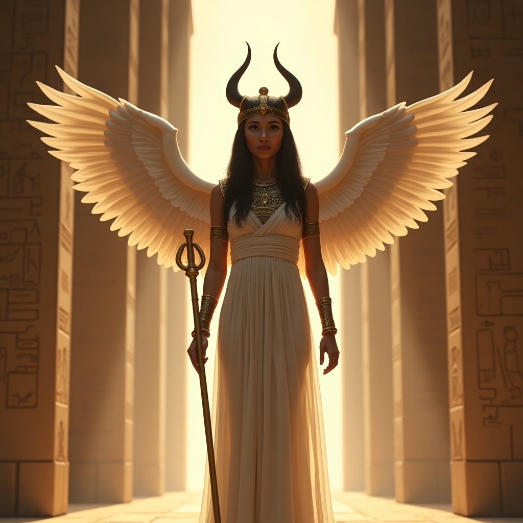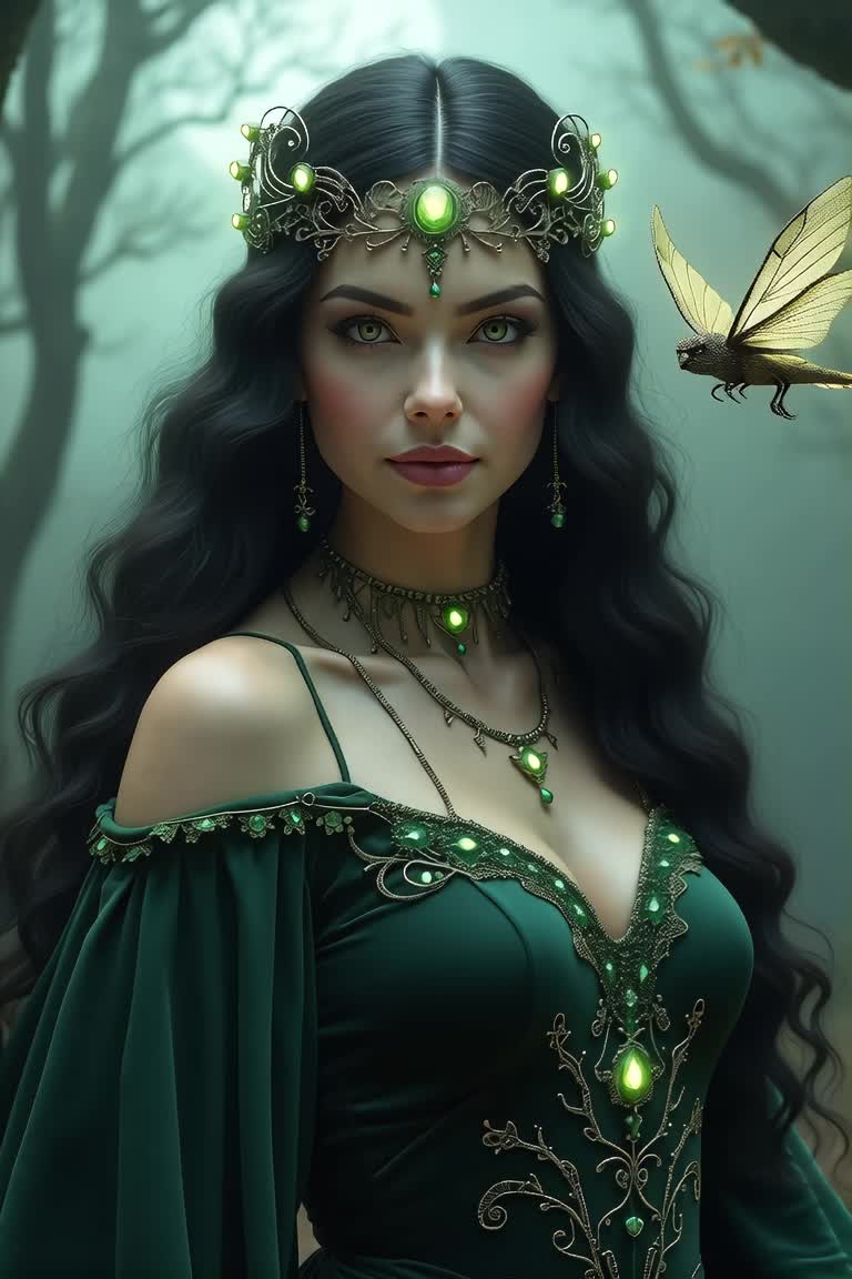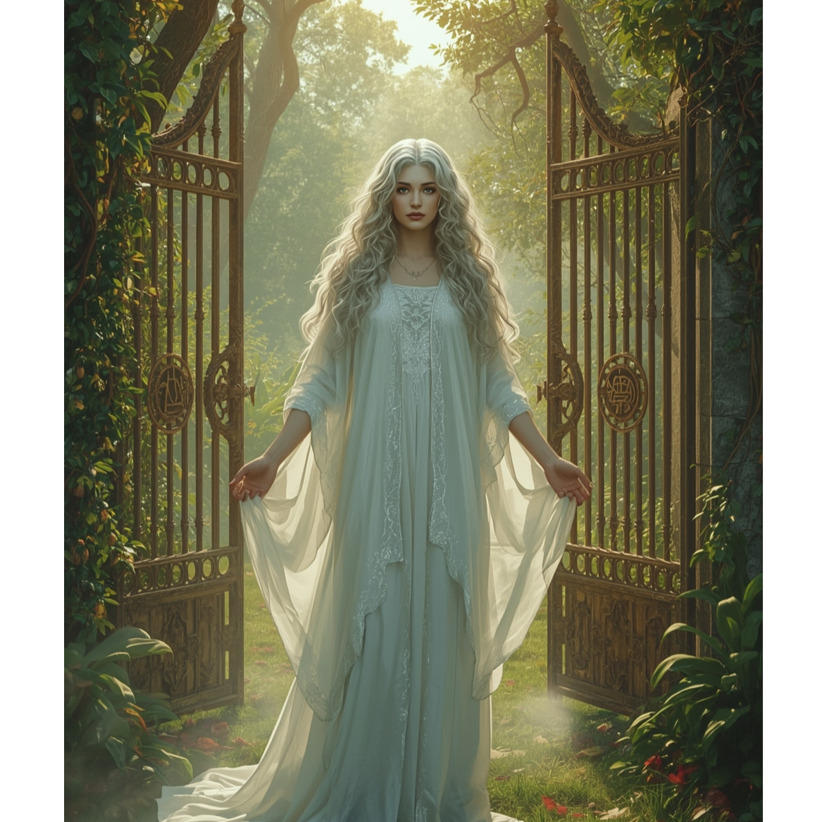 An epic symphonic metal piece unfolding with delicate harp, ethereal synth pads, and subtle orchestral percussion, Verses weave operatic female vocals over lush strings, joined by soaring guitar and brass through grand pre-chorus and chorus, Choirs and polyphonic harmonies elevate the bridge and climax, anchored by timpani and cymbal swells, creating a mystical, cinematic, majestic soundscape