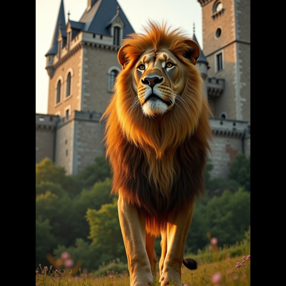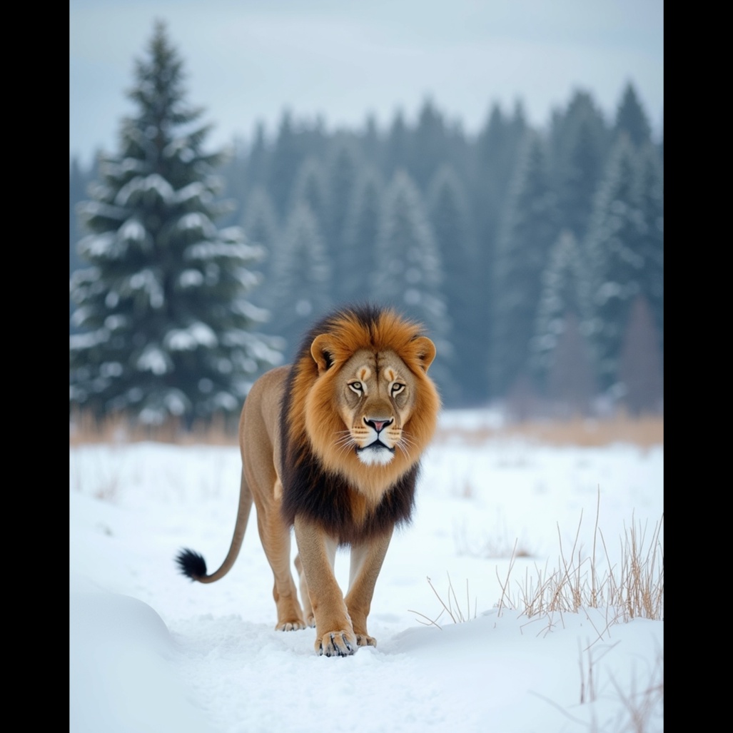 A fantasy-themed symphonic metal track driven by soaring operatic vocals and rich orchestral layering, The intro opens with pipe organ, glockenspiel, and ethereal strings, conjuring a magical, wintry atmosphere, Verses feature galloping guitars and choral pads beneath expressive baritone and mezzo-soprano vocals, The pre-chorus swells with ascending string motifs and tremolo guitar leads, building into a powerful, polyphonic chorus with full orchestration and layered vocal harmonies, An instrumental break features neoclassical guitar leads over cinematic toms and distant choir, The bridge transitions into half-time with dramatic vocal interplay and cinematic swells, The final chorus explodes with heroic intensity, while the outro fades to harp, whispered choir, and faint roaring wind, as if the lion still watches from beyond the snows