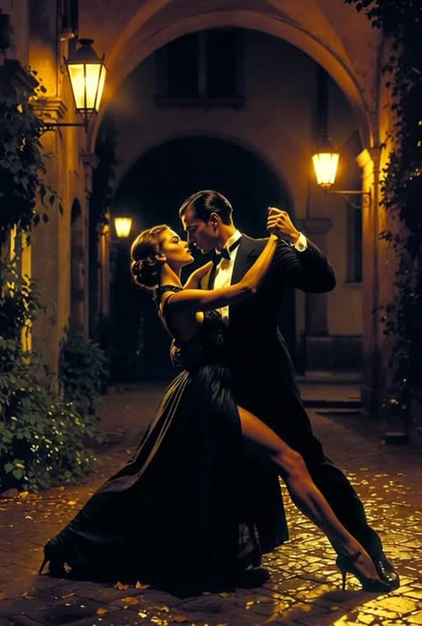 Romantic cinematic Italian dance-pop song with tango and folk influences, Tempo: 115–125 BPM, Instruments: deep pulsing bass, rhythmic drums, bongos, tambourines, soft cymbals, acoustic guitars, piano, harp accents, expressive violin, warm tuba, epic string orchestra, subtle saxophone leads, Style: cinematic pop tango with Mediterranean folk energy, Vocal: female lead, deep, warm, emotional, expressive, supported by soft female choir and gentle male backing vocals, Mood: passionate, nostalgic, dramatic, sensual, hopeful, Atmosphere: lantern-lit piazza, midnight dance, love, longing, movement, elegance, cinematic romance, Language: Italian