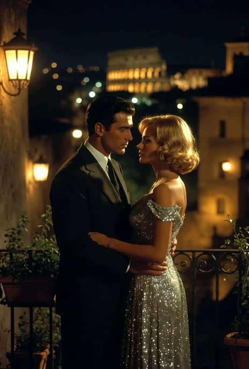 Create a vintage Italian romantic duet inspired by 1960s Italian love songs and film soundtracks, Slow tempo (65–75 BPM), Classic orchestral arrangement: warm strings, gentle piano, upright bass, soft brushes, subtle guitar, Nostalgic, cinematic, Roman night atmosphere, Male and female vocals in a classic duet style — expressive, emotional, elegant, natural, minimal processing, Vocals alternate and intertwine, sometimes singing together in harmony, Traditional structure with verses exchanged between voices, shared chorus, emotional bridge, Vintage analog sound, timeless Italian romance, classic cinema aesthetic