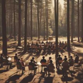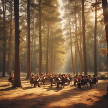 accustic classical brass orchester, loveley melodies, with horns, tuba in bass, trumpet solo, having some fun