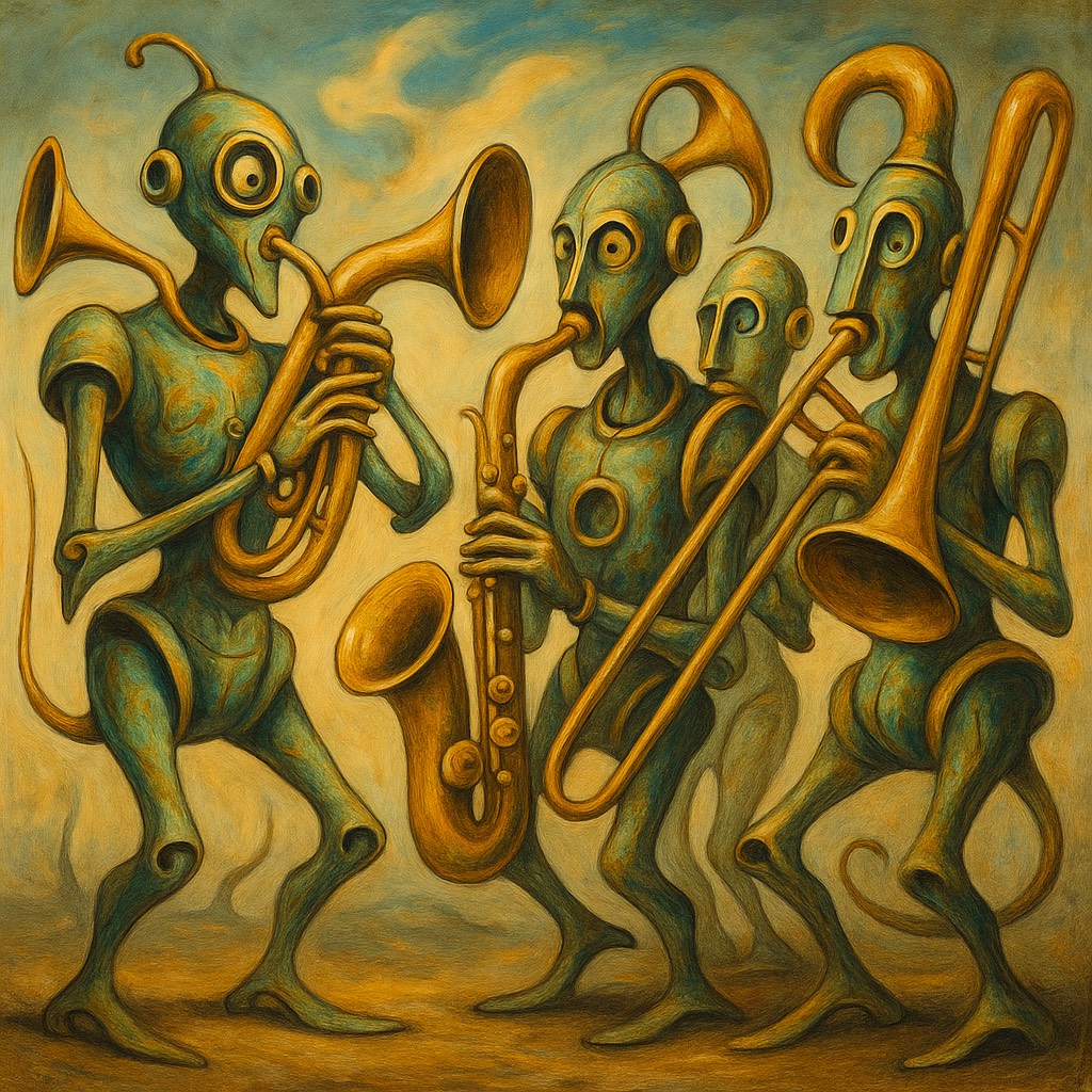 A deep tuba and sub bass pulse anchors the track, reinforcing a long bottom-end groove, A steady, driving drumset locks in with a minimal rhythm section—each instrument playing stripped-back patterns, creating room for bold, gritty baritone sax solos, Sparse keys and layered bass add texture without intruding, Well-timed breaks isolate the bari sax, letting it escalate from raw intensity to playful runs, before the tight rhythm snaps the groove back in