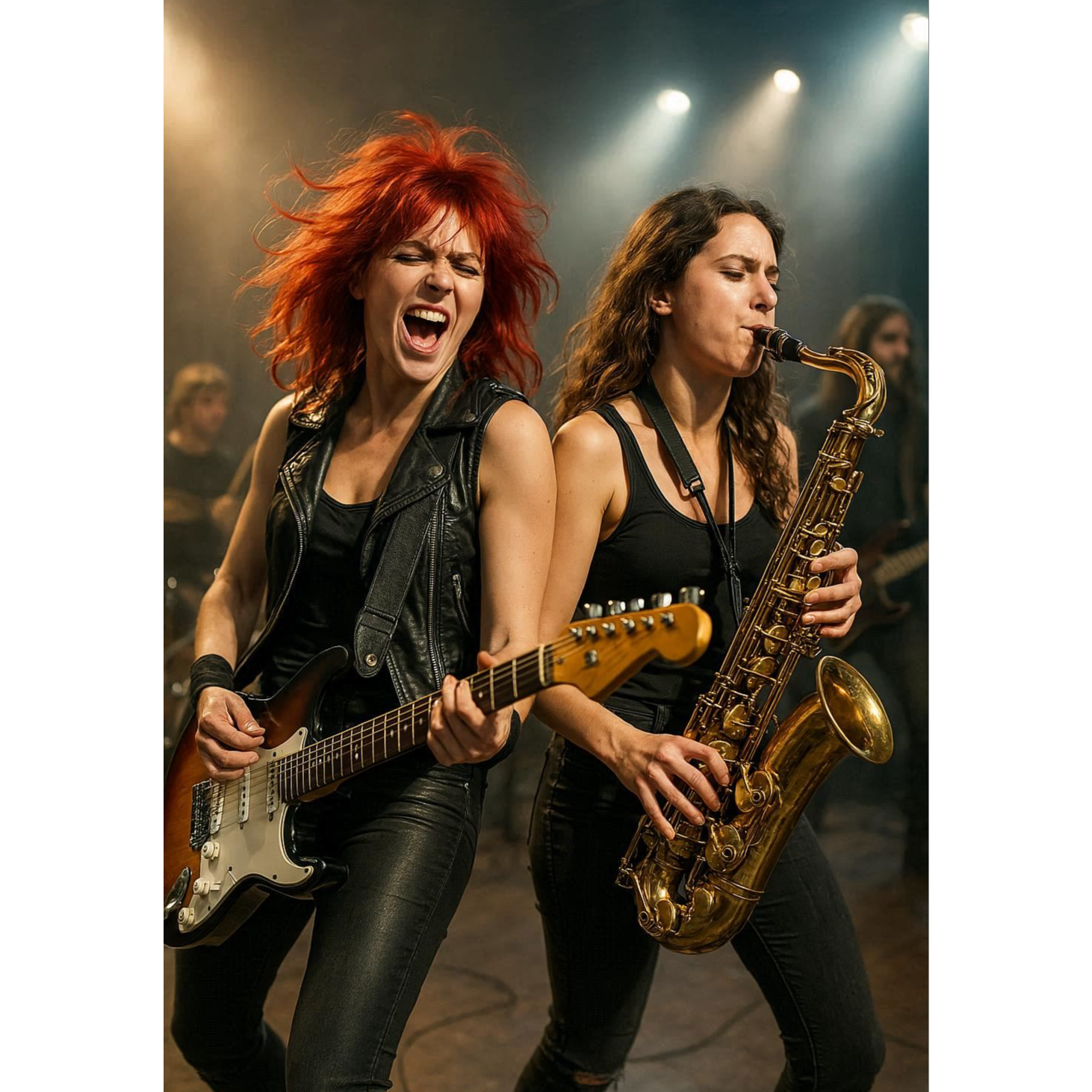 Imagine the electrifying energy of a live rock concert, filled with roaring electric guitar riffs, a powerful driving bass line, and thunderous drum grooves that keep the momentum alive from start to finish, Layered over this high-octane rock foundation, a soaring jazz saxophone emerges, cutting through the wall of sound with bold, improvisational phrasing that blends expressiveness, sensuality, and raw fire, The saxophone solo expands in dynamic waves—sometimes smooth and melodic, sometimes wild and untamed—bringing a surprising jazz spirit into the rock arena, The music should feel like a unique collision of genres: the explosive power and grit of classic rock fused with the fluid sophistication and spontaneity of jazz improvisation, Imagine the atmosphere of a massive stadium drenched in energy, where the crowd is swept away by a rare instrumental journey that is both powerful and soulful, modern yet timeless, loud yet intricately musical