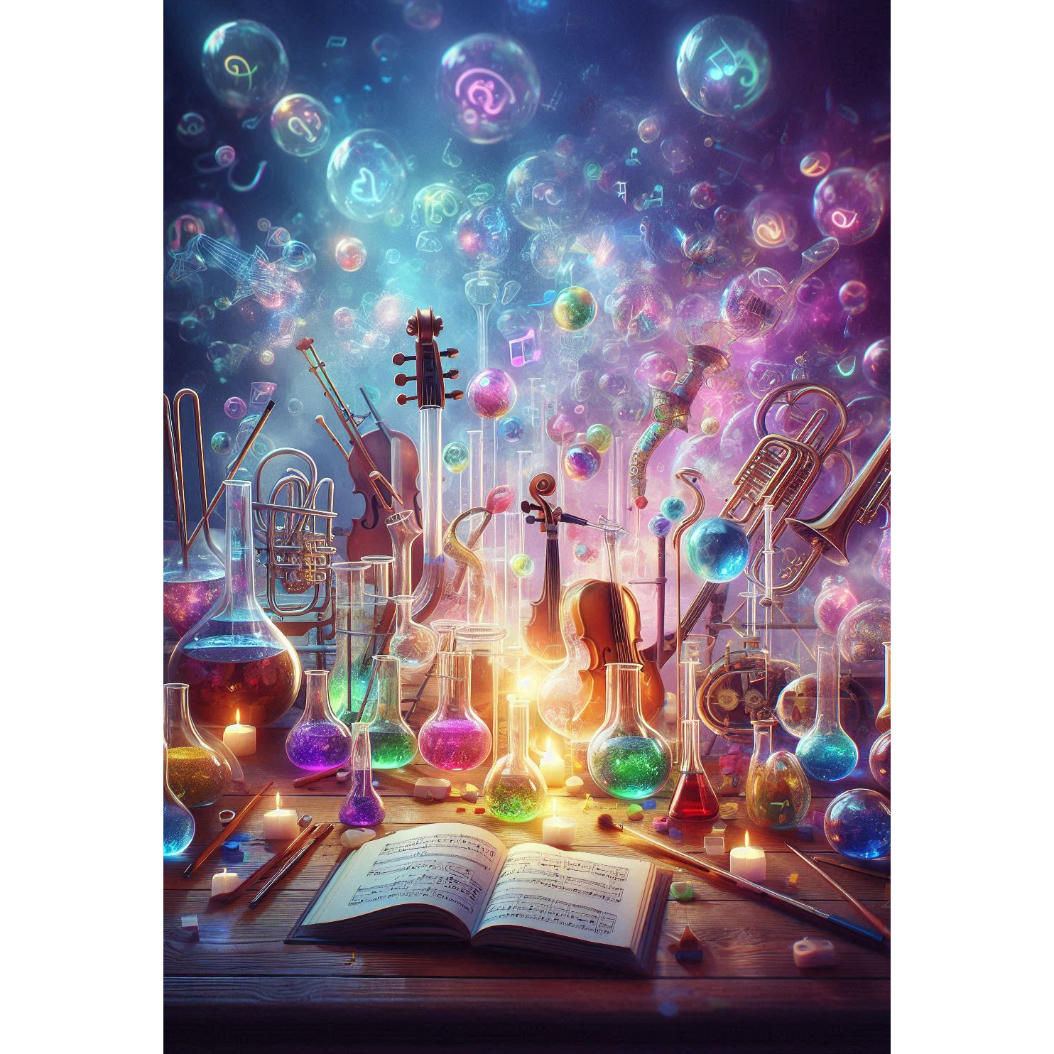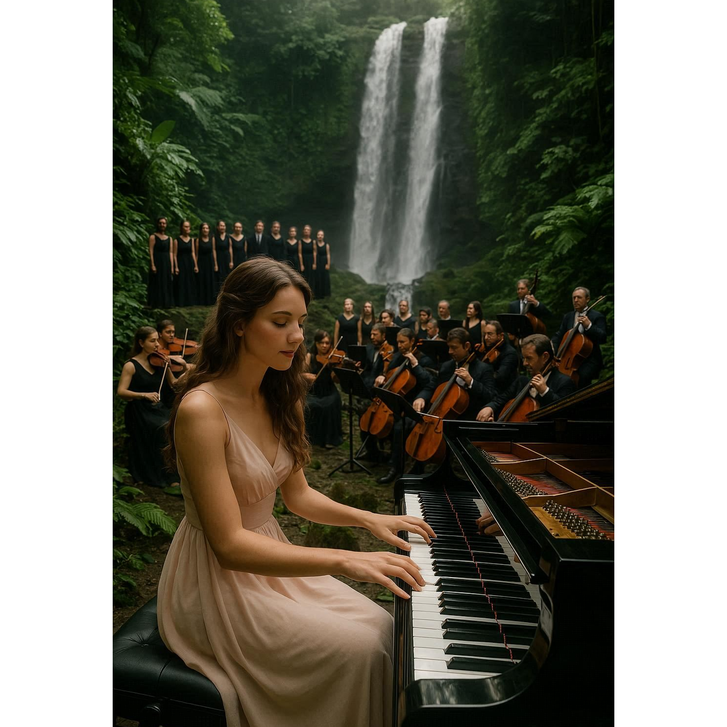 A resonant landscape unfolds as shimmering singing bowls breathe the first tones of dawn, expanding into a deep, voluminous soundscape, Layers of a grand symphonic orchestra rise, brass glowing with golden power, strings weaving emotion through the air, Solo instruments emerge one by one—a flute like wind, a cello like the voice of earth—each adding its own color to the epic tapestry, A majestic choir joins, their harmonies vast and luminous, as if echoing through timeless cathedrals, The steady pulse of the timpani grounds the heavens to the earth, while a single triangle sparkles like starlight above the crescendo, The composition becomes a living force—full-bodied, glorious, and echoing the eternal dialogue between silence and sound