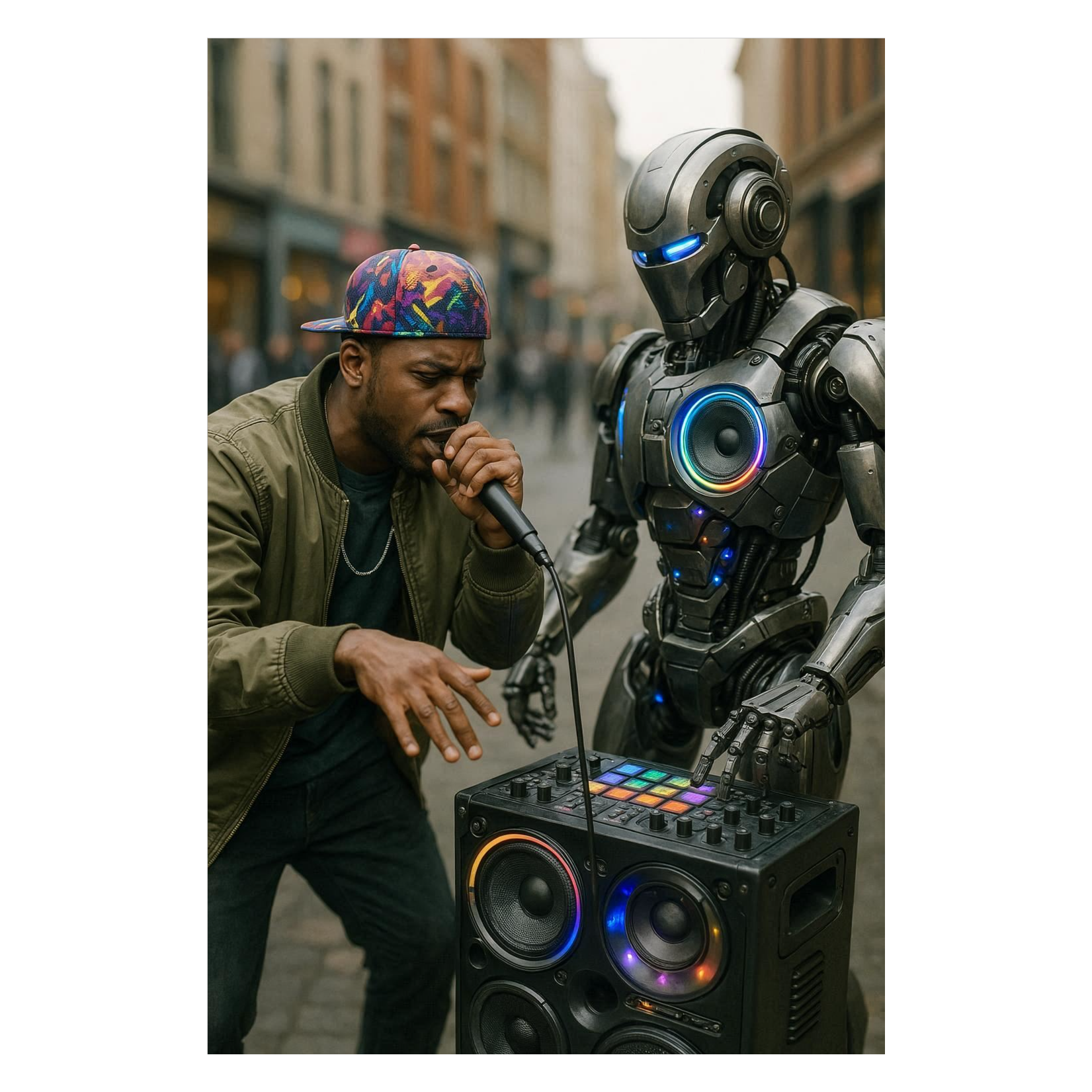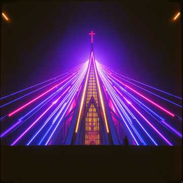 The track launches with a deep tuba bass merged with a grand, resonant church organ, Syncopated percussion pulses in, soon joined by sparkling harp arpeggios, contrasting the bass, Electric guitar riffs inject rock energy, woven with subtle scratching, The song shifts into a techno section—pulsing electronic beats, layered rhythms, and blended acoustic/electronic textures evoke both grandeur and urban grit, crafting a futuristic cathedral vibe