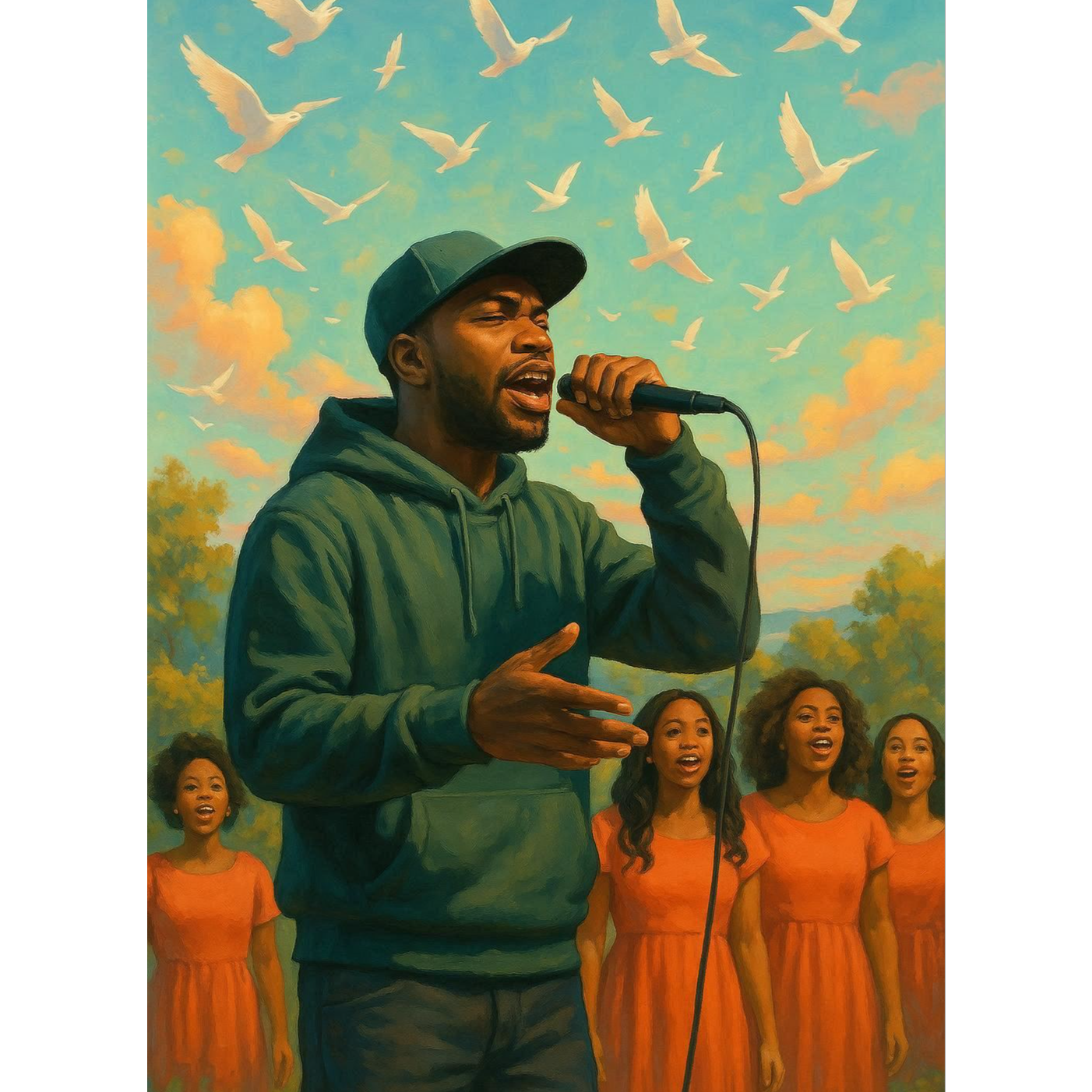 A dynamic German rap track fused with a large gospel choir, The intro begins a cappella with rich, layered harmonies, solemn and uplifting, inviting the listener into a spiritual atmosphere, A smooth hip-hop beat enters slowly, with deep kicks, warm snares, and light hi-hats, as the rapper tells a mindful story about seeing the beauty of the world, The first chorus explodes with the full choir, bright, powerful, and gospel-like, answering the rap in a call-and-response style, In the second rap verse, the beat grows more intense, bass deeper, snare sharper, with the choir echoing lines for emphasis, The bridge builds dramatic tension with call-and-response: the rapper shouts, the choir answers in unison, supported by short percussion breaks, almost like drum rolls, In the grand finale, rapper and choir join together, with claps and reverberant gospel power, while an expressive flute melody or strings soar above, ending in triumph and hope