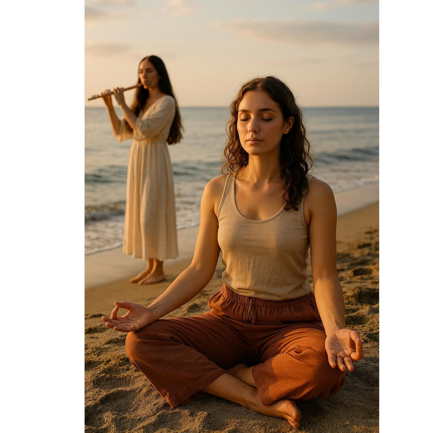 A meditative and deeply calming musical journey featuring soft flute melodies and resonant singing bowl tones, The composition should evoke stillness, inner peace, and a slow unfolding sense of timelessness, The flute plays airy, flowing lines that resemble gentle breathing, weaving between spacious drones and subtle harmonic textures, The singing bowl resonates with warm, shimmering overtones, creating a grounding foundation and long, luminous vibrations that linger in the air, Layer soft ambient pads underneath to expand the soundscape, blending natural reverb with subtle echoes, as if the music drifts through a sacred space, Tempo should remain very slow, minimal, and free-flowing, with long pauses that allow each note to dissolve into silence, No percussion or rhythm-driven elements—only spacious, organic tones, The overall mood should be tranquil, immersive, and meditative, ideal for deep relaxation, yoga, or mindfulness practice, guiding the listener into serenity and presence