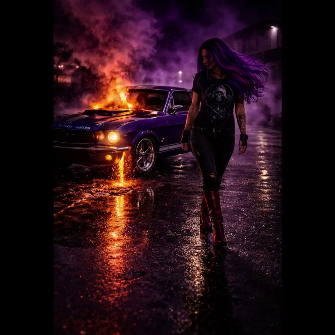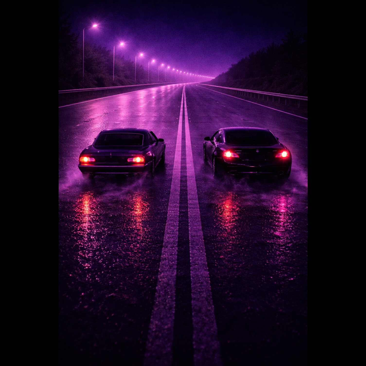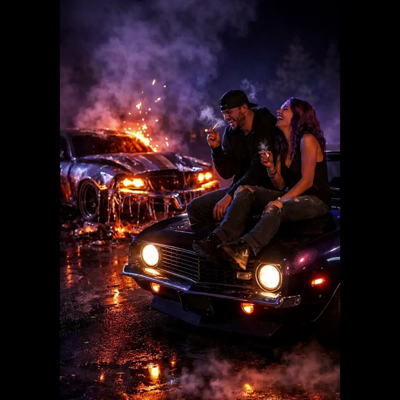West Coast stoner rap, 90โ95 BPM, laid-back groove, Deep bass, simple kick and snare, minimal melody, hazy atmosphere, No jazzy or choir elements, Male + female duet, relaxed delivery, conversational rap flow with occasional melodic lines, Natural timing, slightly loose, not overly polished, Lyrics focused on watching a car melt after a race, humorous, observational, with spontaneous laughter breaks, Vibe: chill, smoky, funny, unbothered, late-night cruising energy, Clean mix, heavy low-end