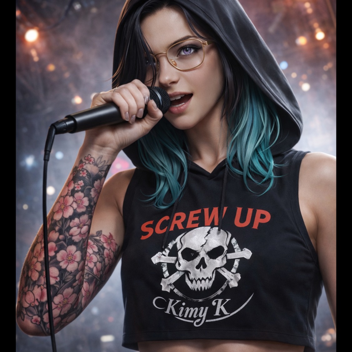 K-pop/J-pop pop production with syncopated synth stabs, crisp hi-hats, and four-on-the-floor kick, Verses ride funky bass, glossy keys, playful guitar, and expressive female vocals, Anthemic choruses add bright pads, punchy claps, layered synths, Bridge strips to harmonies, sleek electronics, then a euphoric drop with electric guitar riffs and Japanese metal double-kick, Bubblegum metal energy, high-fidelity mix, no mud in low-mids, anthemic energy, polished production, wide stereo field