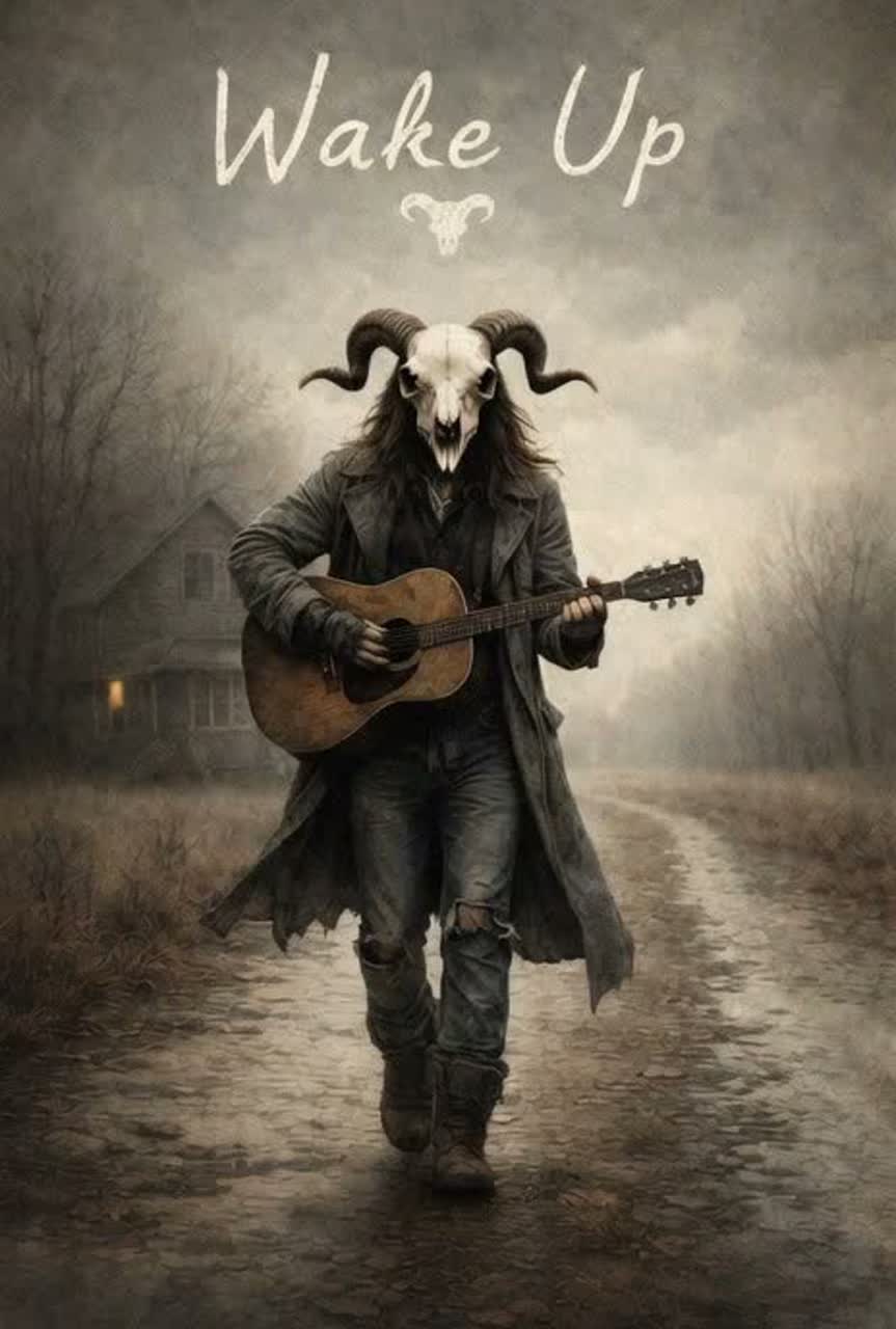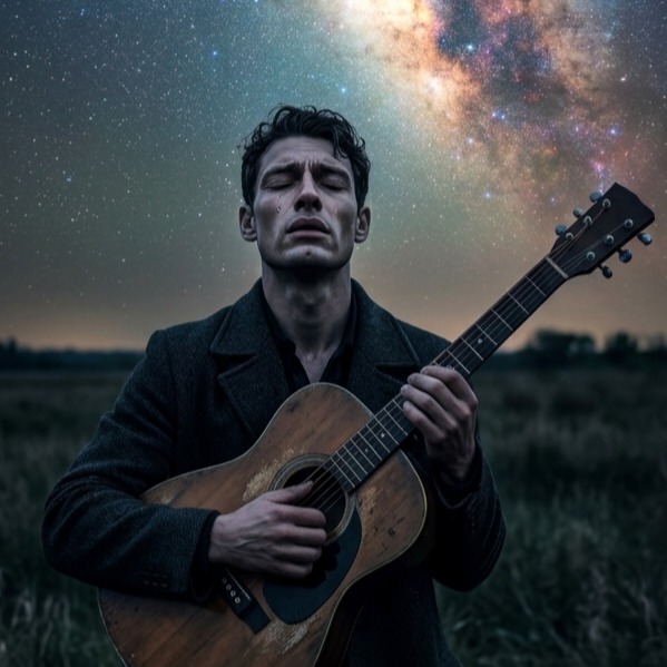 noir Americana fused with art-rock minimalism and spectral folk, slow pulse around 52โ68 BPM in a minor key with uneasy modal shifts; instrumentation centers on dry baritone acoustic guitar, detuned felt piano, bowed electric bass, sparse analog synth drones, distant metallic percussion, reversed textures, and soft tape hiss; vocals are deep, weathered, intimate, spoken-sung with restrained vibrato and existential weight, with occasional fragile upper doubles and ghostlike bgv swells that feel like memory; production is stark and cinematic with heavy silence, analog warmth against digital decay, reverb as emotional distance, textures that bloom then collapse, and sudden dropouts; mood is reflective, mortal, haunted yet lucid, exploring time, identity erosion, and quiet defiance; structure is nonlinear, drifting between song and atmosphere, dissolving into ambient passages, ending like a fading transmission
