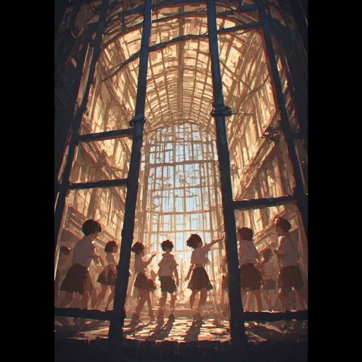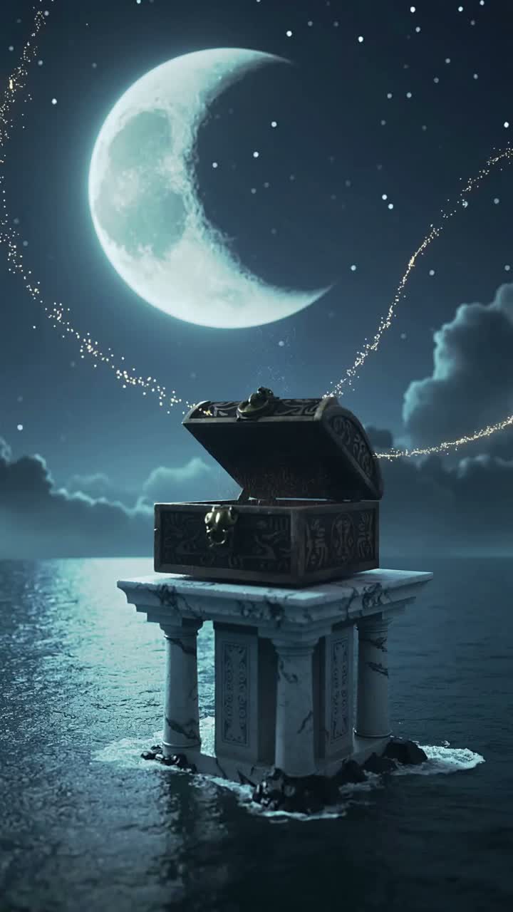 Visual Atmosphere: obsidian shards, storm-light nave, breath on glass, silver hands