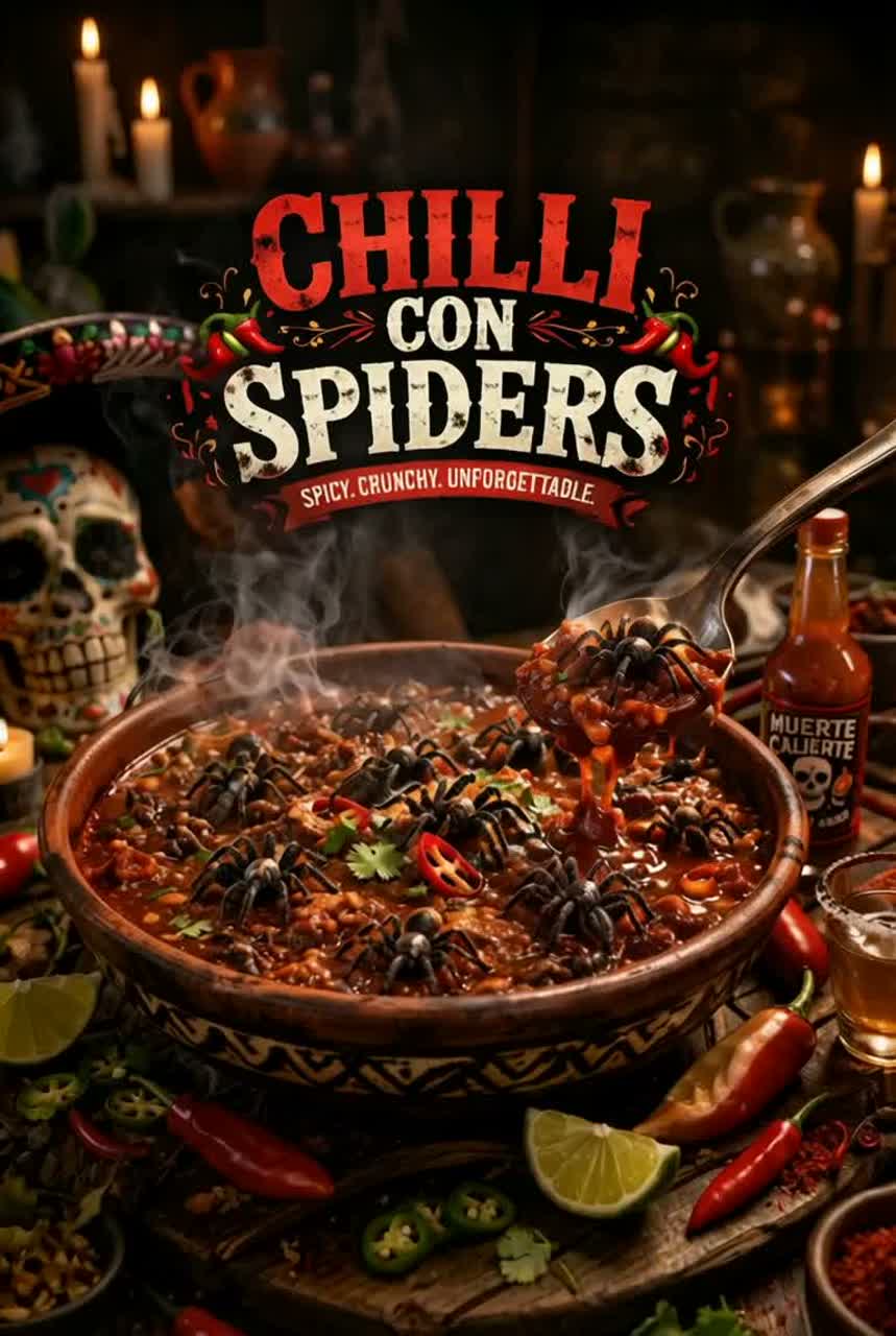Fast ska-punk / mariachi rock comedy anthem, 155 BPM, A minor, Upstroke ska guitars, punchy punk drums, bouncy walking bass, bright brass section (trumpet/trombone) with mariachi-style horn flourishes, handclaps + crowd โhey/olรฉโ shouts, quick stop-start breaks for jokes, Vocal: energetic male with playful attitude, clear lyrics, big singalong chorus hook โChilli con spiders!โ, Structure: short spoken intro โ verse โ pre โ huge chorus โ verse โ pre โ chorus โ funny breakdown bridge โ final chorus bigger โ whisper outro
