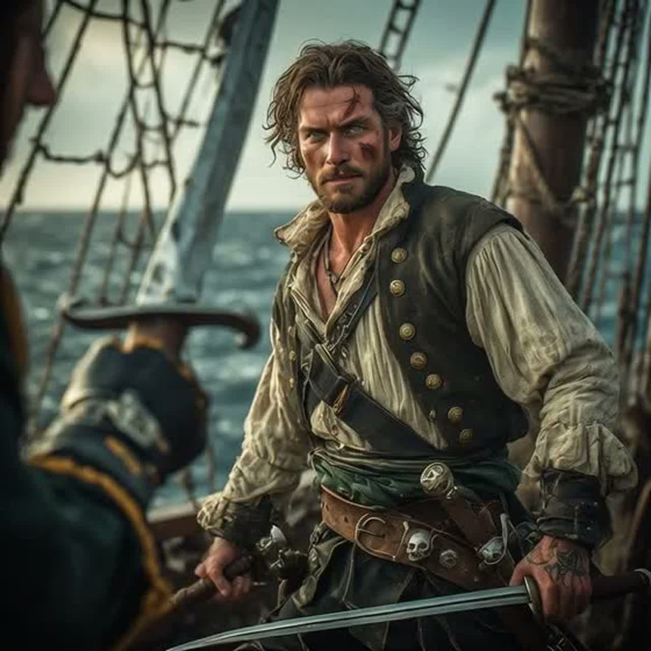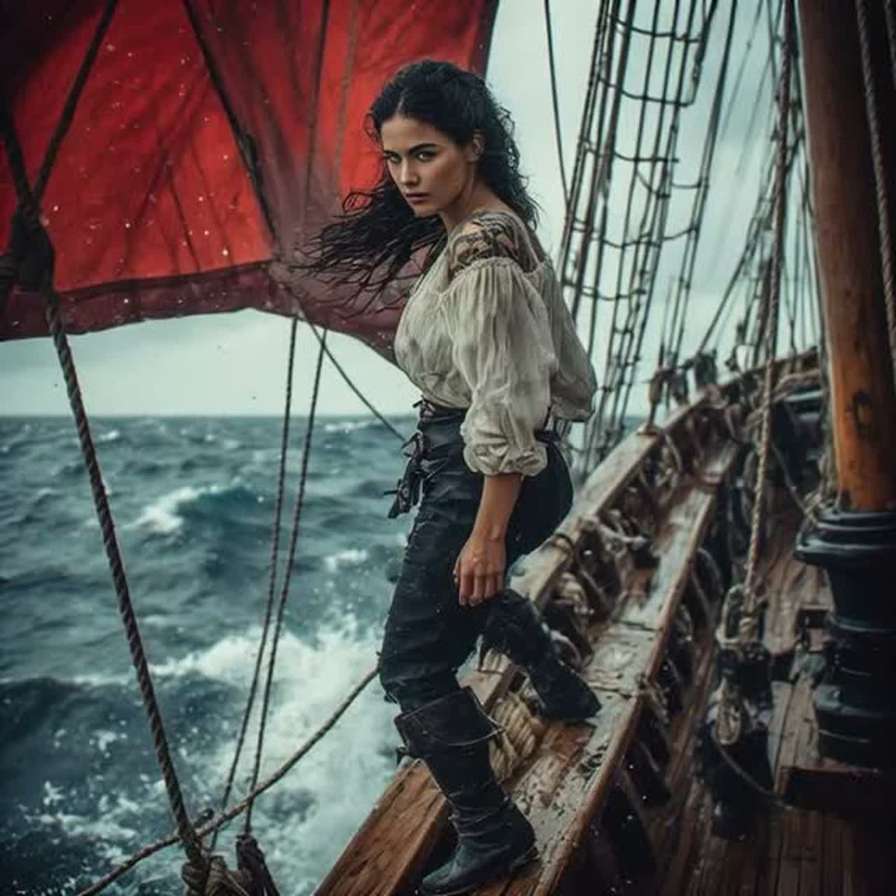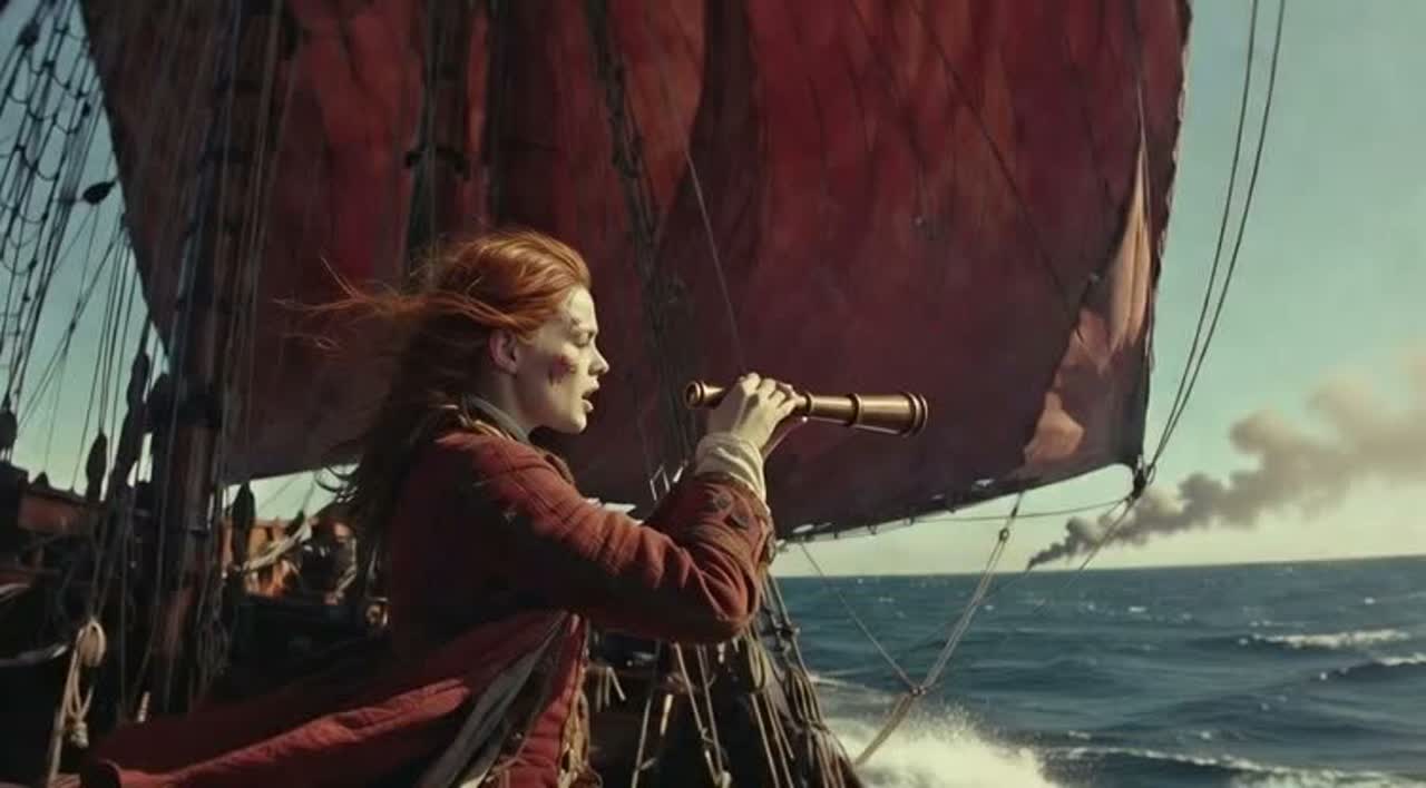 Musique instrumentale dans le style de gatlori, bande originale d’aventure maritime et pirate, évoquant une poursuite en haute mer et une course vers l’horizon, Mode mineur à inflexions modales marines (dorian ou mixolydien assombri), harmonie minimaliste et cyclique fondée sur des accords suspendus, quintes nues et quartes empilées, retardant toute résolution, Ostinato régulier servant de moteur, rappelant le martèlement de la coque sur la houle ; tempo stable, l’accélération étant perçue par l’empilement progressif de motifs rythmiques et dynamiques, Cordes graves et médiums répétitives pour l’élan, cordes aiguës en nappes ascendantes comme des rafales de vent, orgue marin fondation vibrante, piano ou clavecin percussif jouant des motifs courts et insistants, Textures intégrées évoquant bois, cordages et craquements du navire, Structure par couches successives, tension continue sans explosion finale, Mixage large et profond, réverbération longue et organique, basses maîtrisées