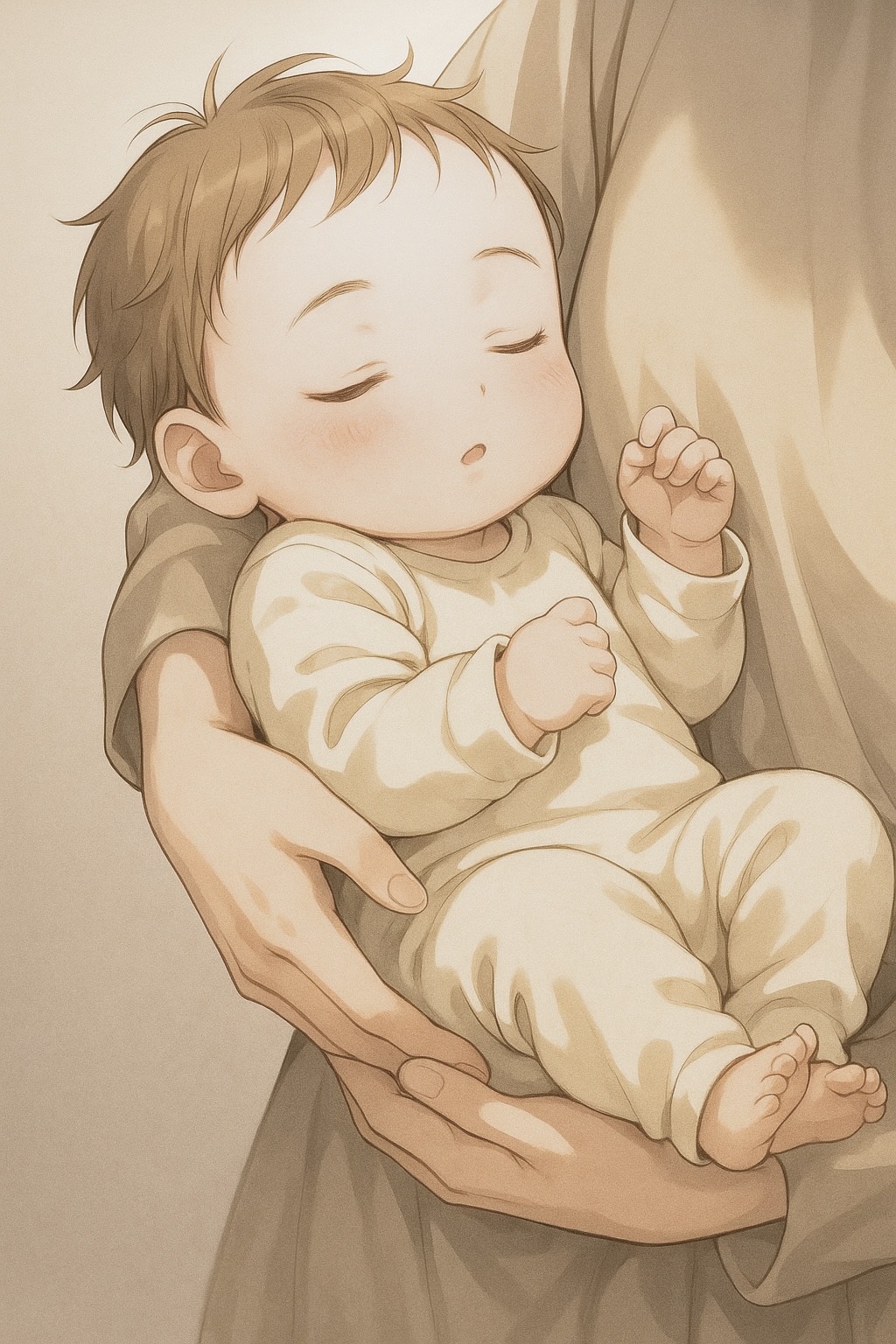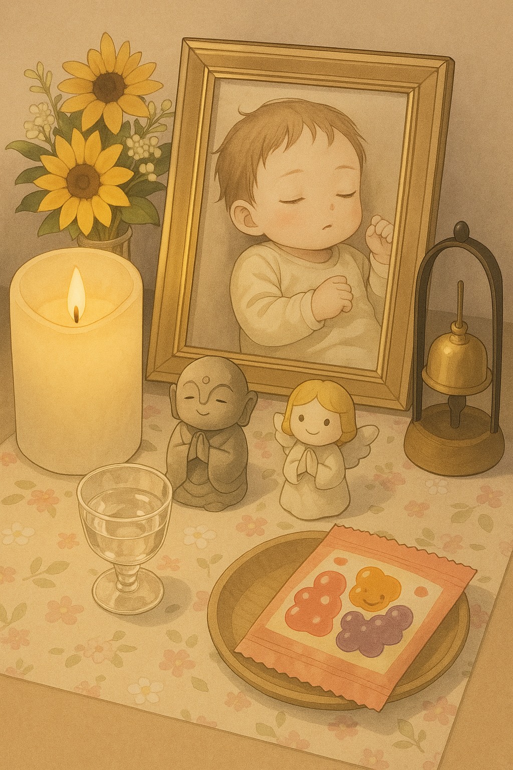 Melancholic and dark Japanese electronic soundtrack-style track, BPM 160, uptempo yet graceful, Arrangement blends atmospheric electronic textures, deep synth layers, and subtle piano motifs with minimalistic orchestration, Infused with Japanese anime and game soundtrack sensibilities: bittersweet melodic progressions, fragile motifs, and emotional build-ups that feel cinematic yet intimate, The tone is sorrowful, mysterious, and immersive, balancing fragility and intensity, Vocals are Japanese, performed in a childlike female voice with fragile breathiness, faint nasal resonance, and a husky edge, slightly autotuned to emphasize an artificial and uncanny quality, Delivery is quiet and restrained in verses, swelling dramatically in pre-chorus and chorus with emotional tension, Harmonies are softly layered in unison, creating a ghostly, otherworldly effect, Overall, the sound evokes a fragile yet enduring bond, like a prayer from a mother to her lost child, blending melancholy with haun