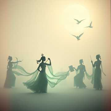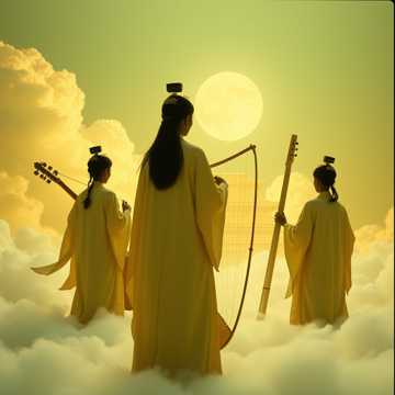 - **Pipa (琵琶):** The core melodic instrument, often played in a "reverse pipa" posture, with a crisp and bright tone, - **Konghou (箜篌):** An ancient harp, providing a soft harmonic background, - **Sheng (笙) and Xiao (箫):** Create an ethereal atmosphere, simulating celestial sounds, - **Dizi (笛子):** A flowing melody, symbolizing the lightness of flying apsaras, - **Drums and Bells:** Light percussion, adding rhythm to the dance, Melodic Flow