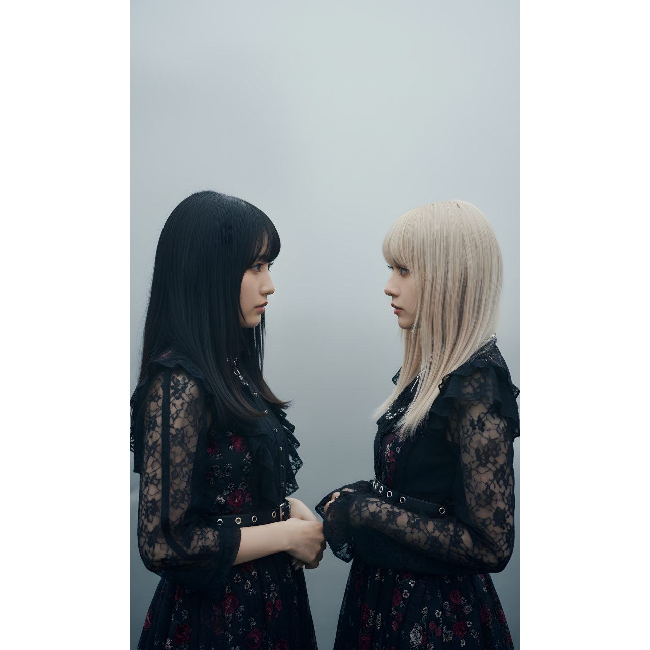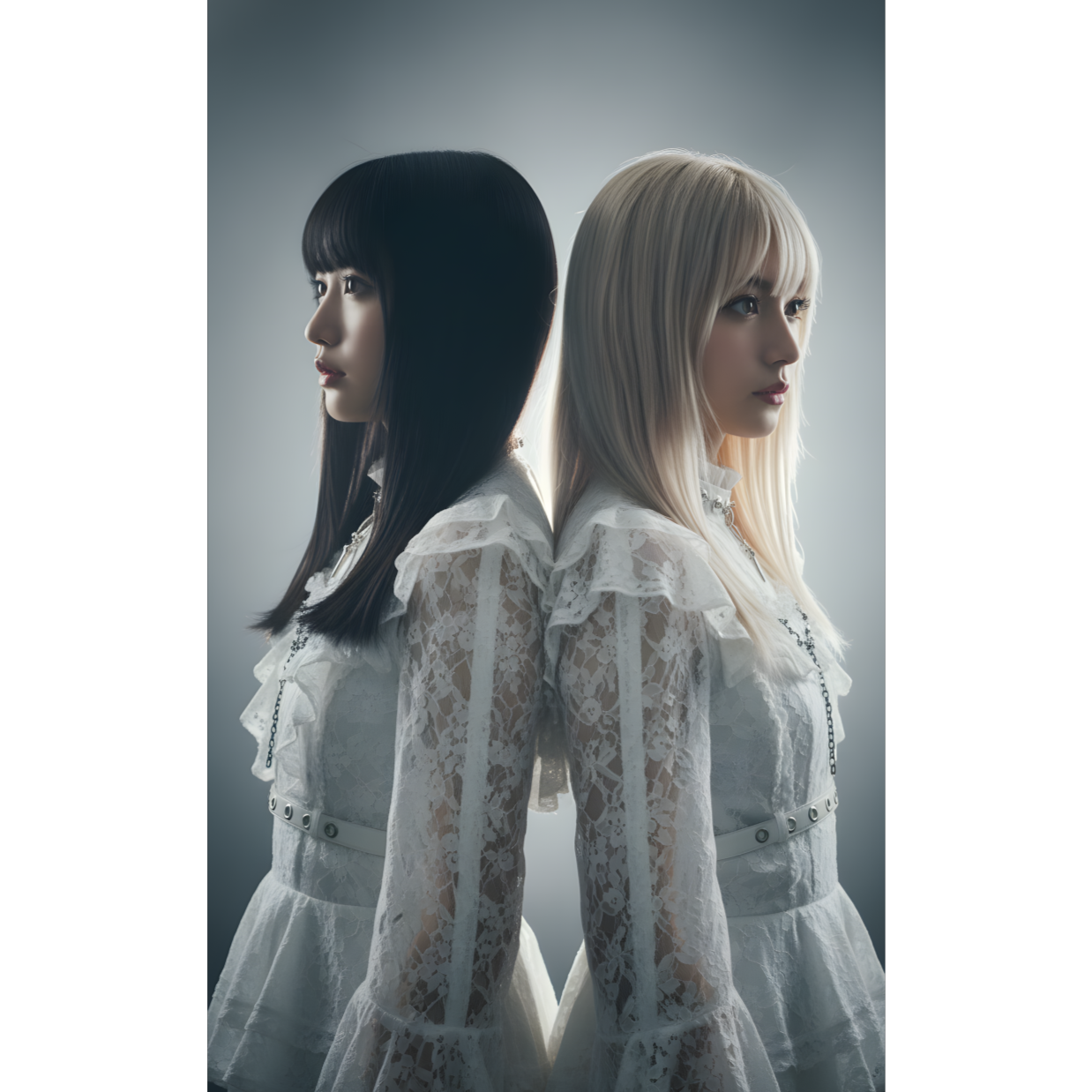 A twin vocal unit, female lead singers, Rin (mature, calm, deep voice) sings in Japanese and is introspective, Lisa (cute, bright, energetic voice) sings in English with an empowering tone, dynamic vocal interplay with alternating solo parts and harmonized chorus, powerful duet with strong contrast between the two voices, j-rock, future rave, breakbeats, glitch, brooding, fast tempo, emotional intensity, melancholic and dramatic atmosphere, soaring melodies, driving rhythm, synthesizer elements adding atmospheric depth and tension, urgent and restless energy, a sense of longing and nostalgia, cinematic and anthemic sound, spacesynth, tight mix, fully mastered, well-balanced highs, mids, and lows, tight sub-bass, centered and controlled, short room reverb with subtle pre-delay, tight slapback delay for space, no pumping on mix bus, spotless noise floor, ‑deep reverb, ‑ambient, ‑hiss, ‑artifacts, ‑male vocalist