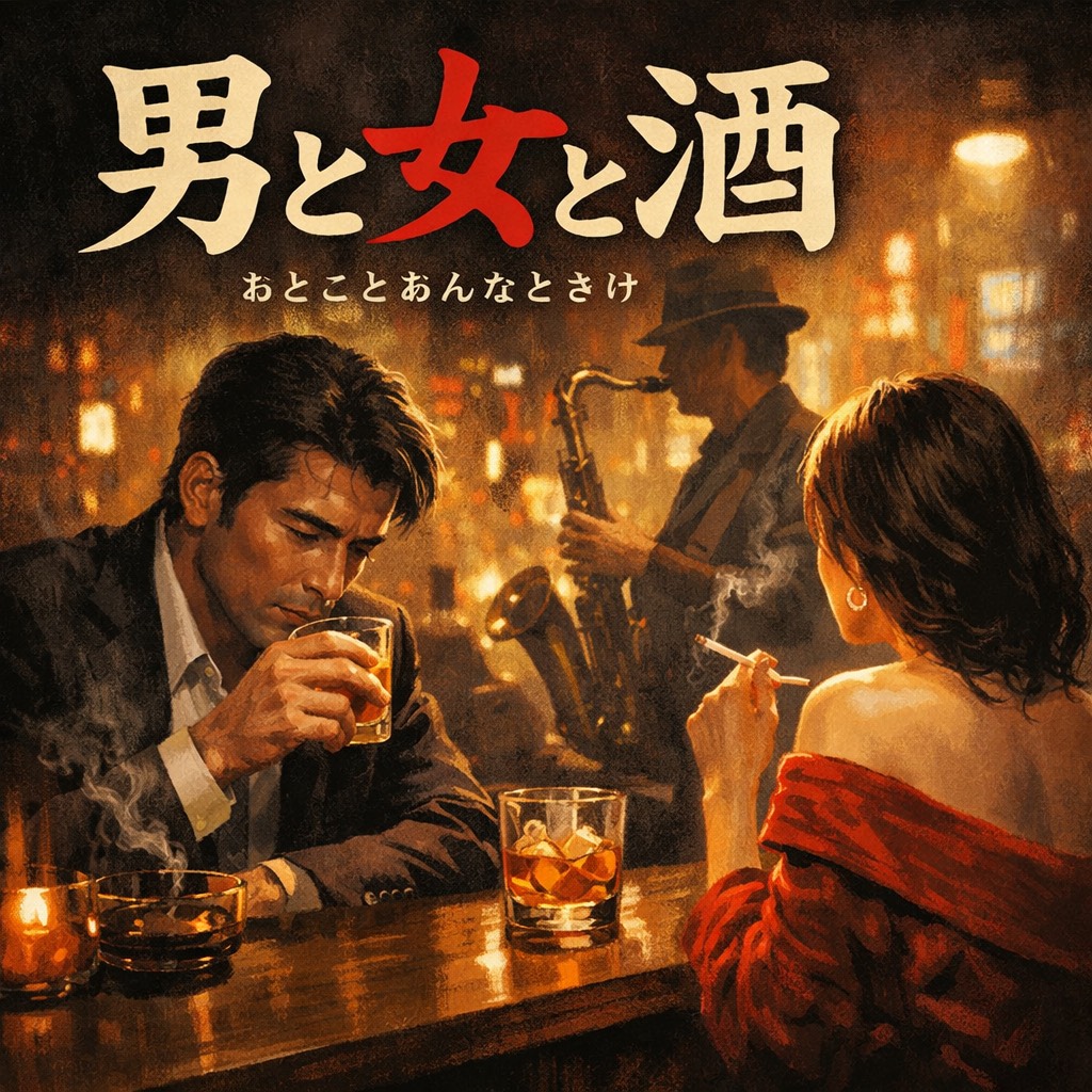 Moody Showa-Era Japanese Kayōkyoku Ballad, Deep Husky Male Vocal, Smooth And Mature Tone, Slightly Breathier In Low Register, Tempo: 72 Bpm, Arrangement: Electric Piano (Rhodes), Warm Analog Strings, Slow Tenor Saxophone Fills, Upright Bass, Gentle Live Drums With Brushed Snare, Atmosphere: Smoky Late-Night Bar, Dim Lights, Whiskey Glass On The Counter, Bittersweet Romance, Style: 1970s–80s Japanese Mood Kayōkyoku, Expressive Phrasing, Long Sustained Notes, Subtle Vibrato, Dramatic But Intimate, Structure: