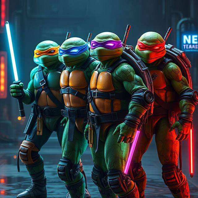 Fast, melodic power metal with an over-the-top, sci-fi superhero tone, Think blazing guitar riffs, ultra-fast double bass drums, shredding solos, and big, chantable choruses, Layer in retro-futuristic synths and electronic FX inspired by 80s cartoons and arcade machines, Add sound effects like warp drives, laser blasts, and ninja weapon clashes, Vocals should be clean, powerful, and animated — energetic and theatrical, telling the story of four mutant ninja brothers fighting across space and time, Include brief synth interludes and breakdowns to build tension before explosive choruses, The mood should be heroic, absurdly fun, and gloriously ridiculous — like an anime opening theme for a metal version of Ninja Turtles in space, Pizza-fueled honor meets hyperspeed mayhem!