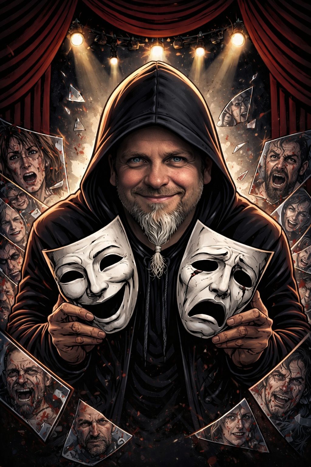 Mroczny rapcore / boom bap 90s, tempo 88 BPM, tonacja mollowa, Ciężka, przesterowana stopa, industrialny werbel z metalicznym pogłosem, glitchy i subtelne efekty ambientowe w tle, Flow agresywny, techniczny, z dynamicznymi pauzami i zmianami rytmu w zwrotkach, Refren melodyjny, mantryczny, pół śpiewany z echem, szerokie pady, chop & screw momenty, Scratche i sample: “kłamstwo… kłamstwo… prawda skryta…”, “maska… maska…”, “kto… winny…”, powtarzane jak mantra, Klimat teatralny, introspekcyjny, dramatyczny, napięcie, konflikt wewnętrzny, odkrywanie fałszu, hitowy, wpadający w ucho