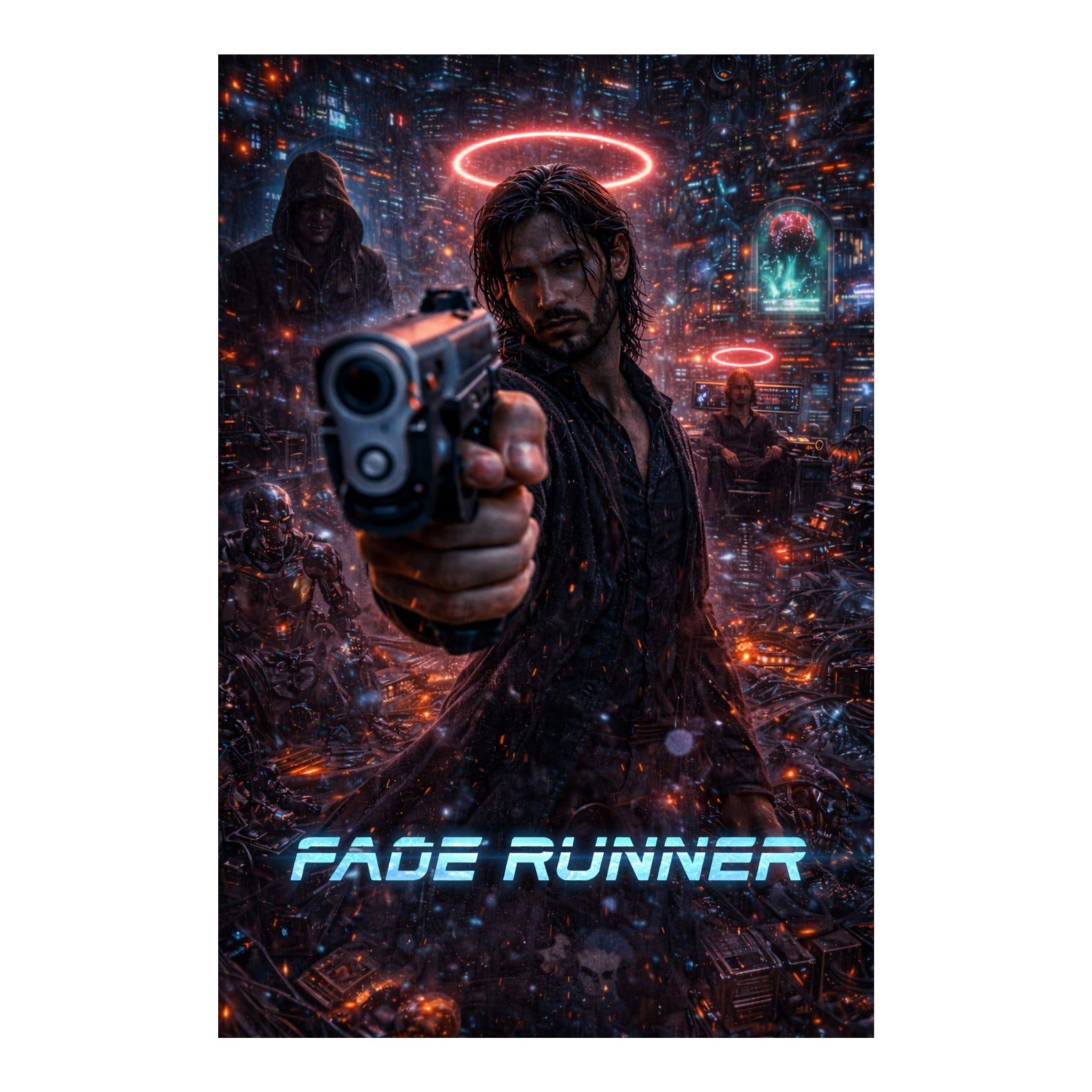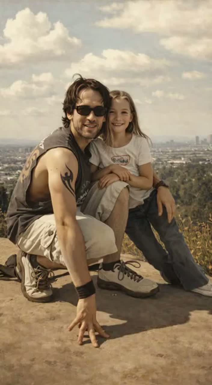 Cinematic industrial alt-rock + dark synthwave, 92 BPM, D minor, Intro: distant Hollywood night ambience (wind over hills, faint city hum), low sub pulses like a heartbeat, Add subtle “infrared scan” SFX: sweeping filtered noise, sonar pings, HUD beeps, Drums: tight kick/snare with gated reverb, tribal tom accents, occasional metallic clanks, Bass: gritty distorted synth-bass following the kick, Guitars: palm-muted chugs in verses, widen to soaring octave leads in chorus, Vocals: intimate noir spoken-sung in verses, anthemic hook in chorus with stacked harmonies, Predator-style gargled vocal SFX: wet throat-click + modulated growl bursts, pitch-shifted and ring-modulated, used as call-and-response before chorus and at end of lines (“guardian gene”), Bridge: drop to near-silence—breath, faint clicks, distant roar—then slam back with full band + riser, Outro: city hum + fading gargle + one final sonar ping