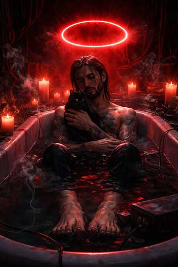 Cinematic alt-rock w/ tribal undertones + shock-wise performance energy, 78–82 BPM, Dark studio-night intro: water pour/ambience, low synth drones, distant Harley rumble, faint vinyl crackle, Verses: sparse beat, tight kick, muted toms, whispered-intense male vocal (calm INFJ, amused), Diablo enters w/ menacing low harmony + glitching “monitor flicker” FX, Chorus: explosive but controlled—heavy drums, distorted bass, wide guitars, soaring restrained melody, Bridge: spoken-word exorcist roast (witty, surgical, Carlin-esque cadence), tape-stop cuts, sudden silence, then tribal drums surge back, Add subtle MJ-style rhythmic guitar stabs + syncopated vocal ticks, Overall: Black Mirror studio siege meets mythic hero’s journey—dark, funny, reverent, powerful