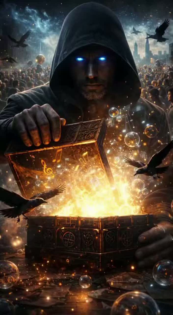 Cinematic noir-trap + alt-rock + dark synthwave, 92 BPM, minor (E minor), Intro: room-tone + faint vinyl crackle, distant thunder, slow irregular heartbeat sub (boom…boom), then a cold piano motif, Verse: tight 808 + rim-clicks, muted guitar swells, whispered/baritone vocal with intimate mic proximity, Pre-chorus: pads widen, choir-like synth, rising filtered noise, Chorus: huge drums + bass, anthemic hook, gritty guitars, cinematic strings, Verse 2 shifts to half-sung rap cadence—surgically precise, controlled, Bridge: drop to heartbeat + piano + single vocal, then rebuild to final chorus with choir and wide reverb, Mood: sovereign, untriggerable, “mirror made of lightning, ” controlled menace without cruelty