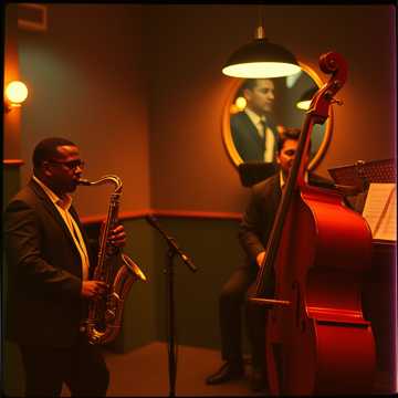 Abstract modern jazz exploration 76 BPM, expressive tenor sax leads with growl and bends, upright bass walking, light brushed drums swing, subtle piano comping, warm Hammond organ drones, Male baritone vocalise (abstract scat with unexpected hissing "shhhh", "ssss", breathy exhale effects, improvisational), Soft female alto backing vocalise (distant echo with soft "ssss" wind-like sounds, breathy harmonies), Style: introspective abstract jazz with unexpected hissing vocal textures, saxophone-focused emotional journey 2025