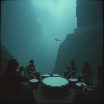 Native American-inspired instrumental with vocalise 72 BPM, haunting cedar flute leads, deep hand drum pulse, rattle percussion, distant wind and eagle cry FX, subtle drone, Male low baritone throat vocalise (deep breathy "hey-ya", "ho-oh", improvisational), Soft female alto backing vocalise (distant "aaaah ooooh" harmony, ethnic vibrato), Style: introspective Native American ritual soundscape, emotional healing chant 2025
