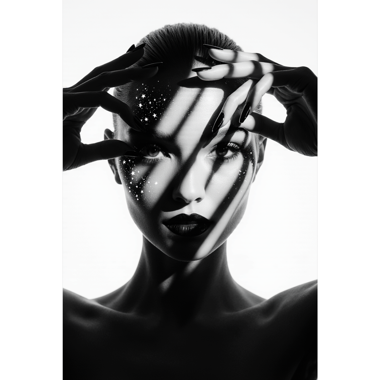 A lush Experimental Art Pop soundscape merges baroque haze and dreamy R&B with trip hop grooves, Glittery orchestral flourishes weave with crisp digital atmospheres, airy synths, and subtle vocal effects, Dreamy textures mix with warped hyperpop edges, all in a clear, elegant, noir-tinged mix