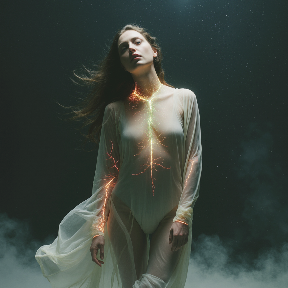 The song opens with wide synth pads, faint field recordings, and ethereal percussive elements, Verses are minimal, featuring haunting female vocals, then bloom into a chorus of harmonies, deep bass, radiant synths, and enveloping textures, Climaxes with spiritual, cinematic, ritualistic layers, cacophony