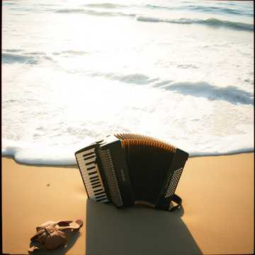Chillhouse track with summer vibes, soft, warm accordion riffs, mellow guitar, lounge keys, light percussion, smooth bass, subbass, Relaxed seaside mood, BPM slow, perfect for golden hour reflection