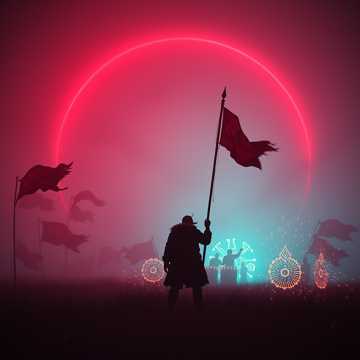 heavy metal, deep male vocals, cowbell, native American chanting