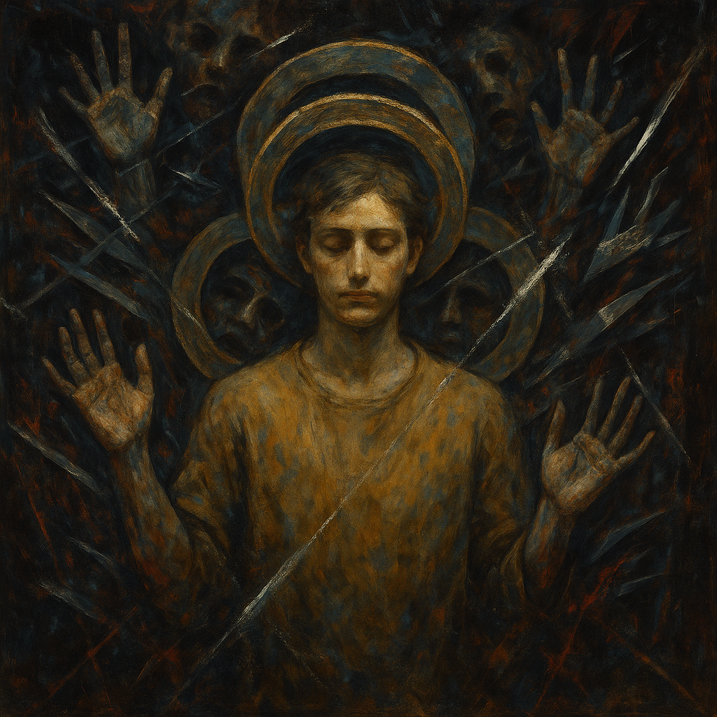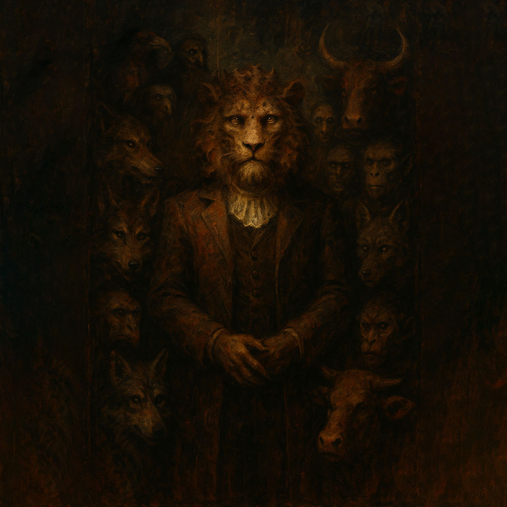 cinematic hypnagogic art-pop, slow-build anthem, moral allegory, calm orchestral intro, refined male or neutral vocals, minimalist piano, restrained strings, observational tone, gradual tension, evolving percussion, primal drum layers, tribal rhythms, chant-like hooks, vocal grit escalation, jungle atmosphere, feral harsh gritty bridge and final chorus, philosophical, dark poetic