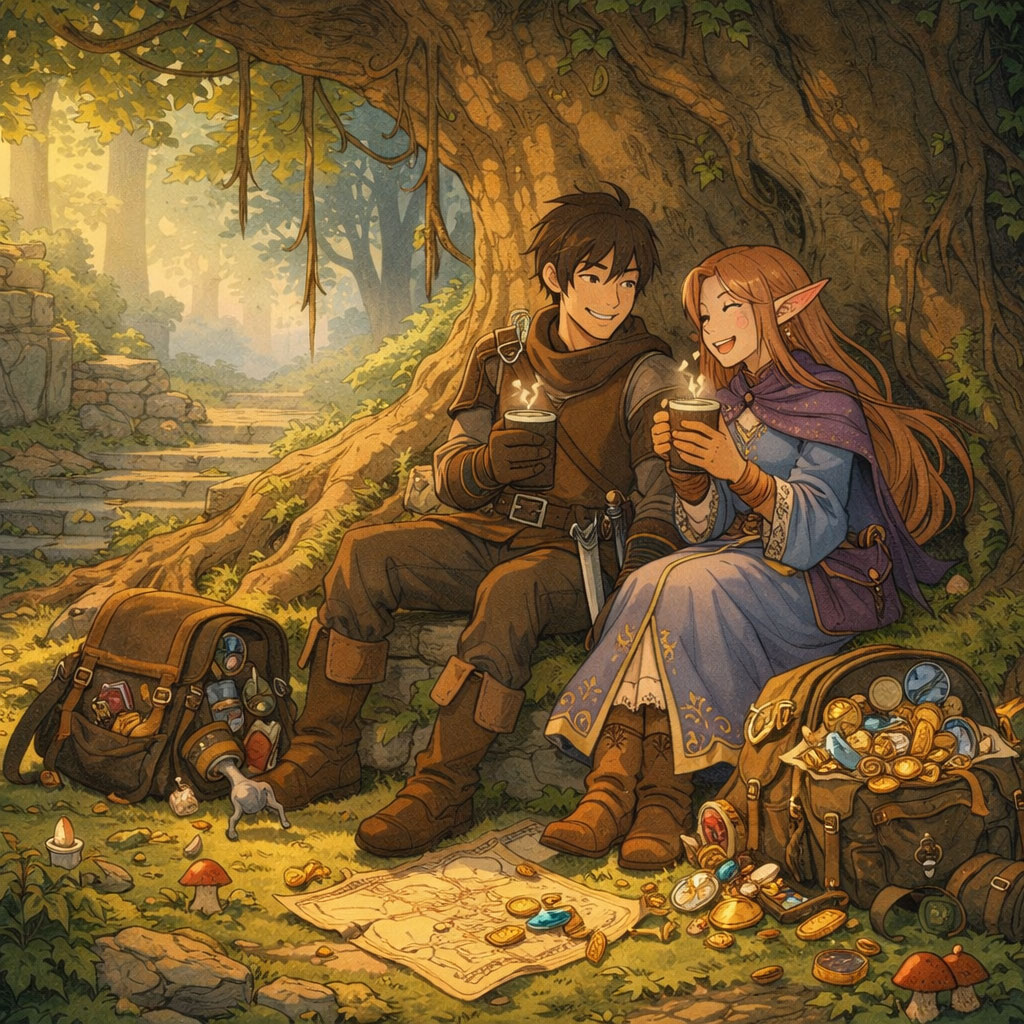 lofi bedroom folk pop, intimate male and female duet, warm mid-range male vocal, spoken-word leaning delivery, gentle melodic phrases, soft expressive female freestyle rap, journal-entry feel, dusty keys, vinyl crackle, muted guitar swells, soft bass, subtle lo-fi drums, faint bell or chime accents, warm tavern ambience, lantern-lit mood, quiet adventure, late-night calm, intimate and reassuring, finger snaps, whistling, harmonica accents