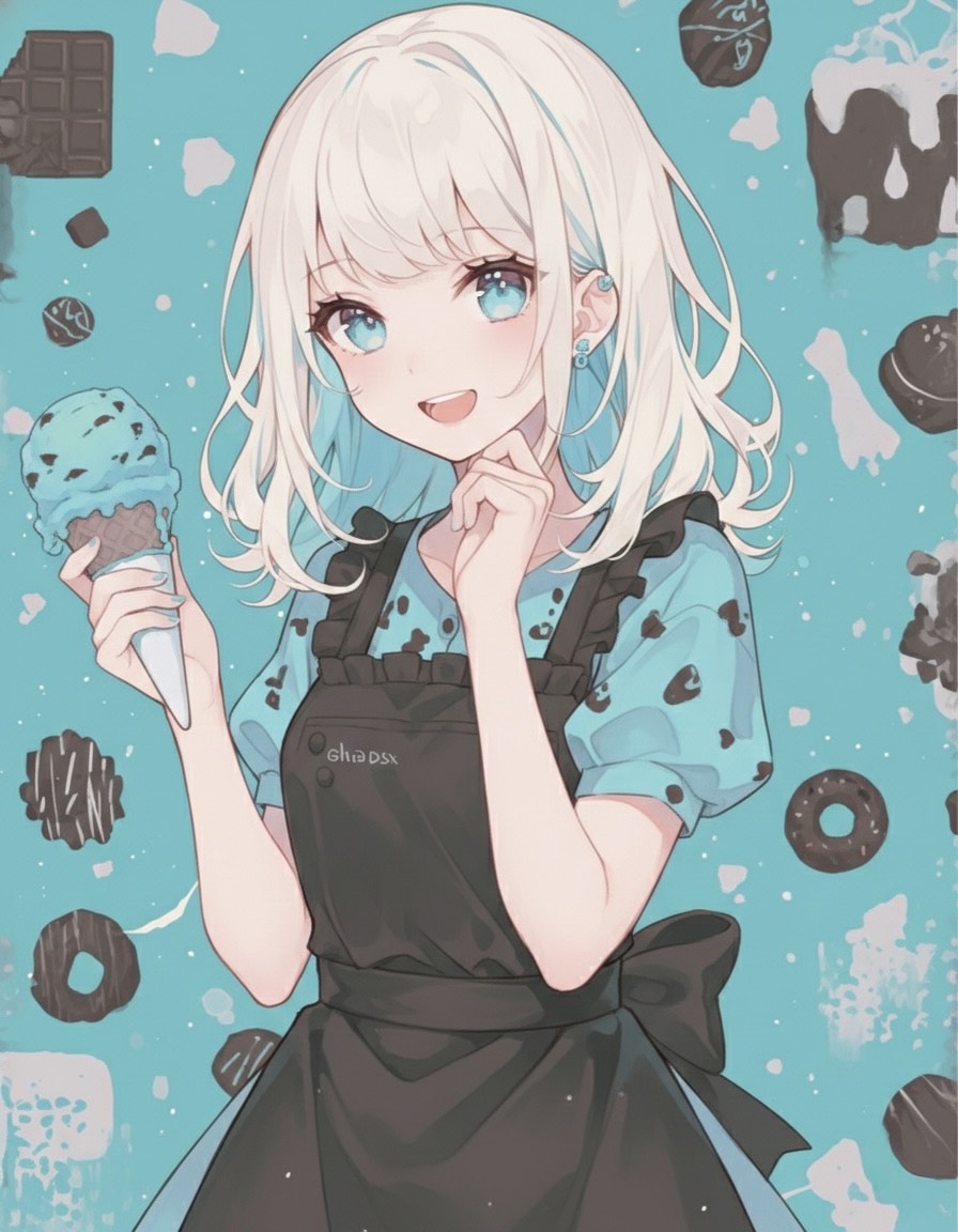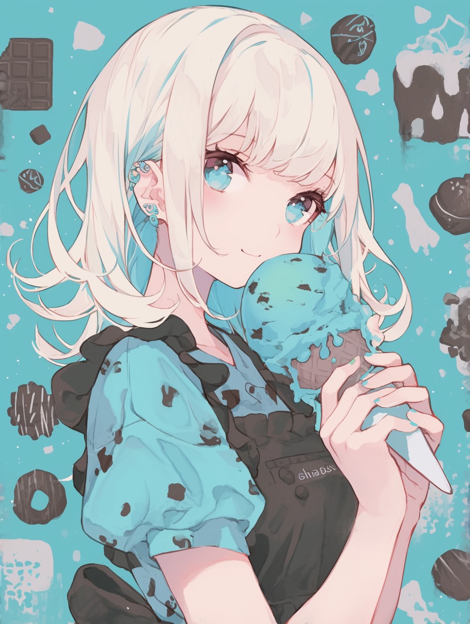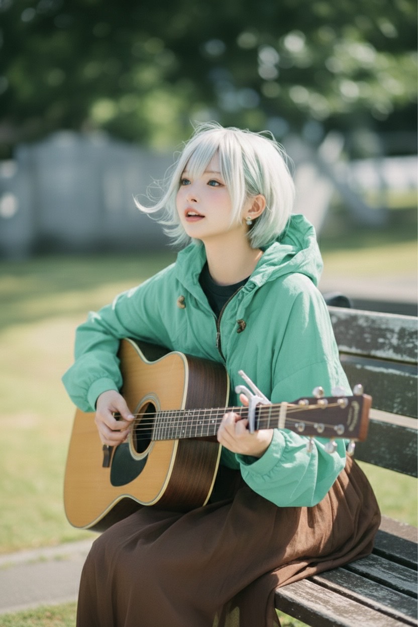 Slow and intimate Japanese acoustic ballad, 72 BPM, 4/4 beat, Gentle young female vocal with a soft, airy tone and delicate emotional delivery, Sound: only acoustic guitar, warm fingerpicking with occasional soft strumming, no other instruments, Japanese lyrics about a deep love for choco mint ice cream, weaving sweet nostalgia, playful charm, and romantic warmth, Cozy, heartfelt atmosphere for a quiet solo performance