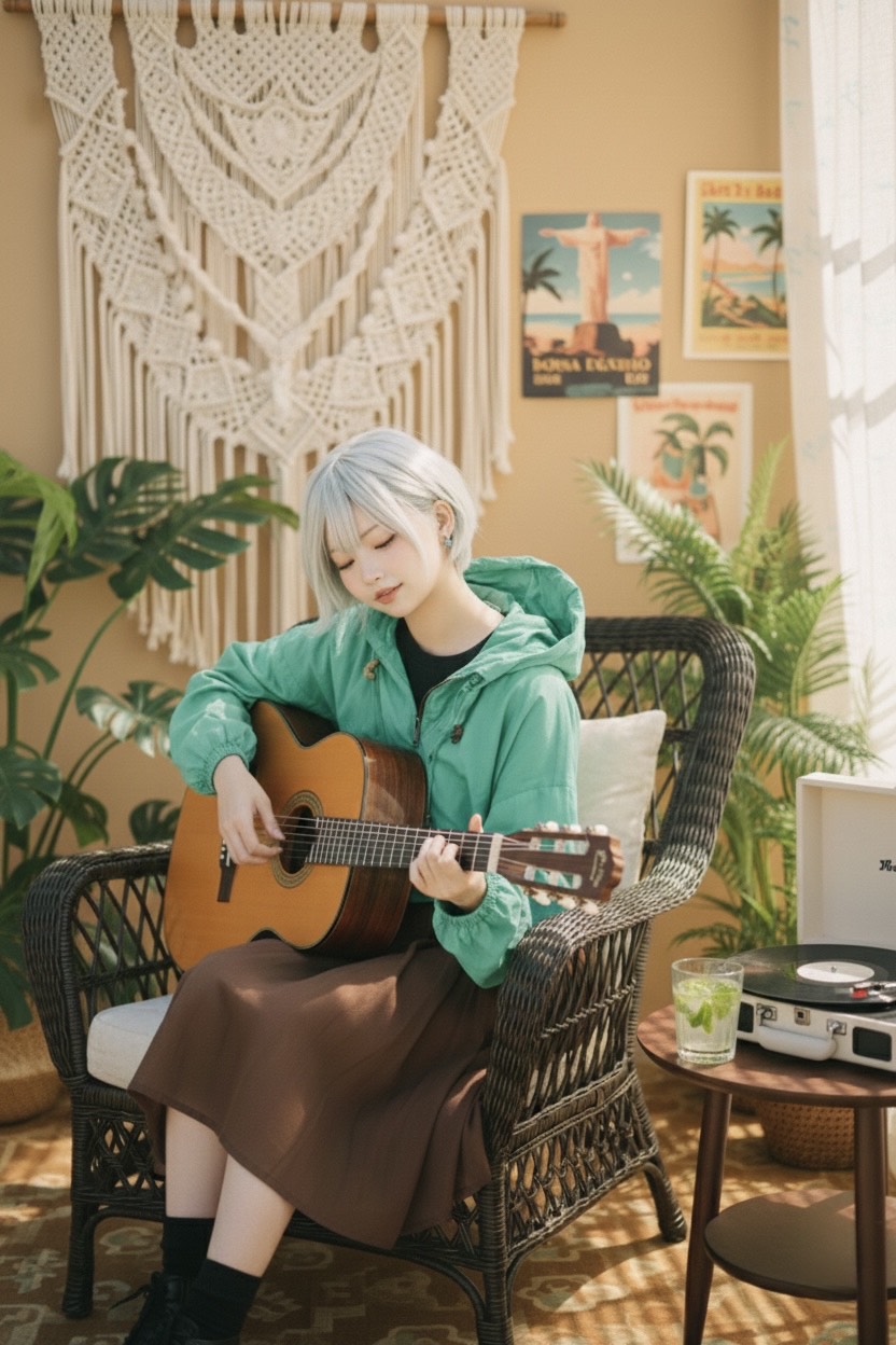 folk, bossa nova, nylon string acoustic guitar, soft percussion, gentle swing, relaxed tempo, airy and elegant mood, afternoon to sunset atmosphere, high-spec female vocal, soft and warm tone, natural phrasing, Japanese lyrics, calm and refreshing feeling, song about chocolate mint, quiet romance, subtle sweetness, no heavy drums, no synth, no aggressive elements, bossa nova, swing, acoustic, tone, gentle, soft, vocal, natural, warm