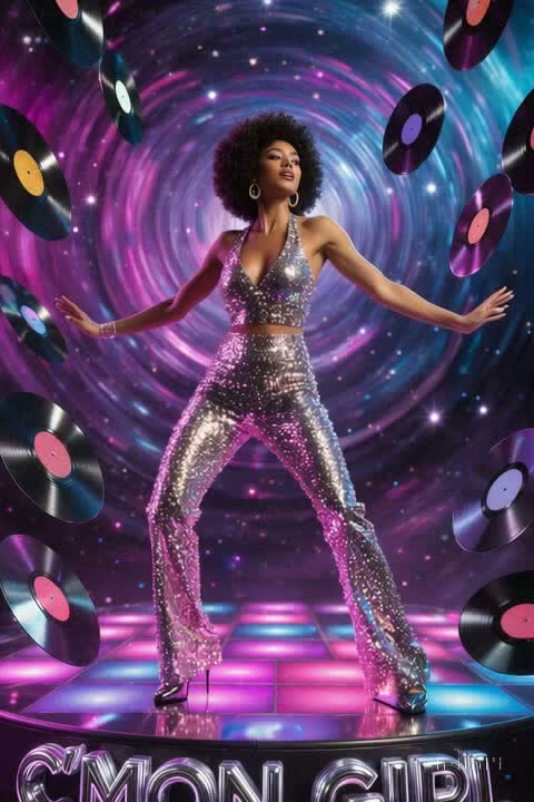 "High-energy disco-funk instrumental with powerful backbeat groove, Kick drum on every beat (four-on-the-floor), bright open hi-hats driving the rhythm, sharp snare accents on 2 and 4, Groovy slap bassline, funky muted guitar riffs, lush disco strings, bold brass stabs, shimmering electric piano, sparkling analog synths, Classic late 70s disco dancefloor vibe with a modern polished mix, upbeat, vibrant, infectious groove, No vocals, no audience, pure instrumental, "
