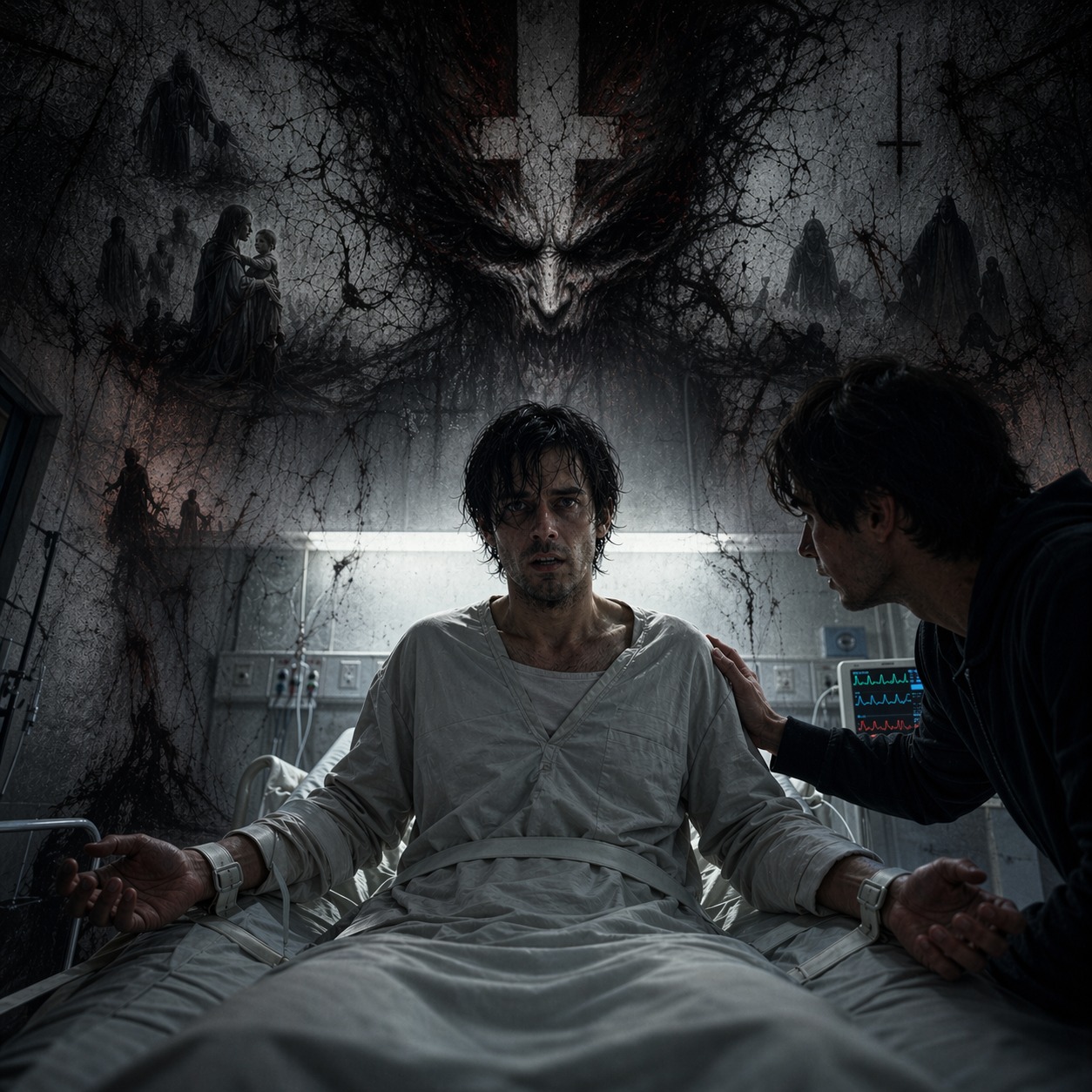 A terrifying fusion of Darkwave, Death Industrial, Power Noise, Dark Ambient, and minimal neoclassical in D minor at 74 BPM, The nightmare opens with a broken heartbeat pulse, cold drones, curtain-scratch textures, and a deep close-mic voice, Pre-choruses bring turbine pressure and rising panic, Choruses become pure torment: crushing distorted synth walls, punishing low-end, industrial strikes, and raw screamed pain, Verse two adds stereo whispers, glitches, and fragmented paranoia, The bridge abandons rhythm for total nervous-system collapse with sirens, sub-drones, and a demonic shadow voice, Then everything cuts dead: a high clinical hiss, lonely piano, and cello reveal the hospital reality, The final chorus stays fragile, human, and tragic—no industrial return, only diagnosis, exhaustion, and the warmth of a friend who stays