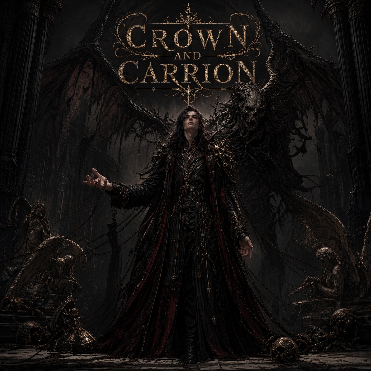 A forbidden fusion of Darkwave, Ritual Dark Ambient, Blackened Doom Metal, and Industrial Black Metal in D minor at 95 BPM, Lucifer is rendered through cold regal synths, military precision, and a deep elegant baritone; Beelzebub through ultra-low doom guitars, diseased industrial percussion, swarm-like noise, and a rasped corrupted voice, Invocations open in cavernous drone with throat-sung choir, chains, and bells, Verses alternate between seductive darkwave control and rotting filth, while choruses unite both powers in a huge wall of synths, doom riffs, The interlude escalates into Pandemonium with faster blackened intensity, The final chorus must feel like an orchestrated infernal triumph, then the outro slows into a ceremonial doom crawl with bells, murmured ritual voices, and fading flies