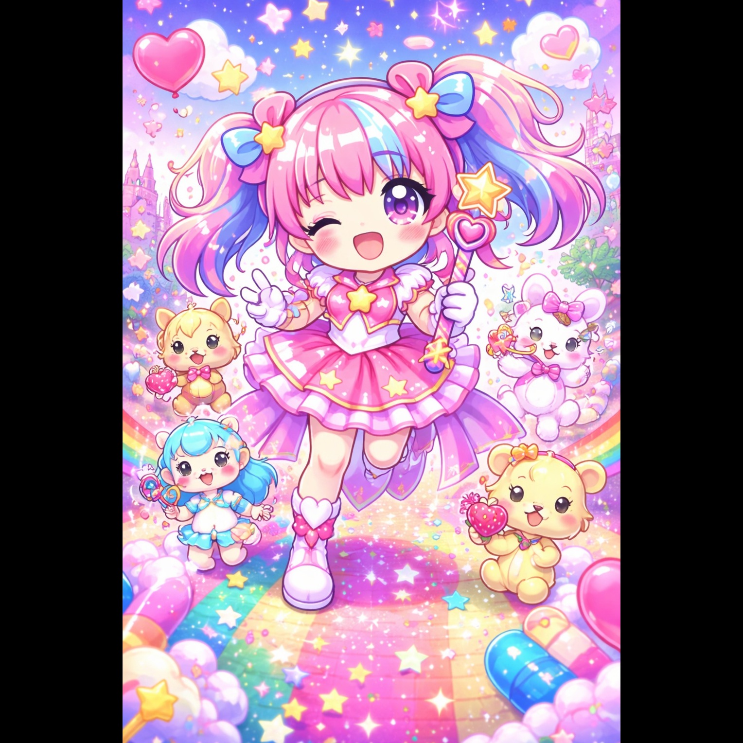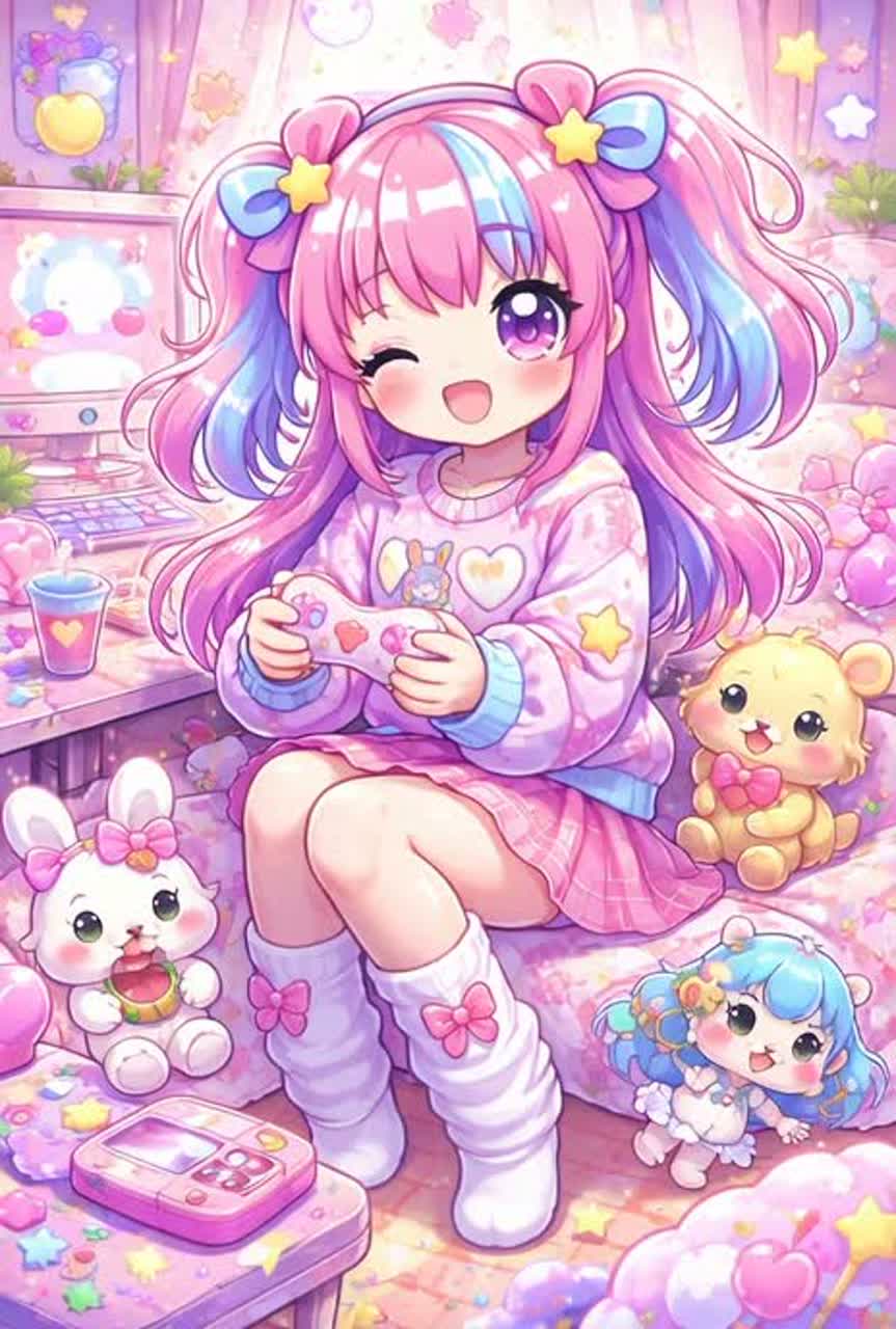 Style: Ultra-sweet anime idol tuning, lo-fi sparkle, gentle glitches, bouncy forward-moving syncopation