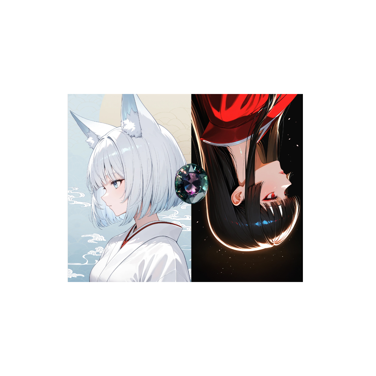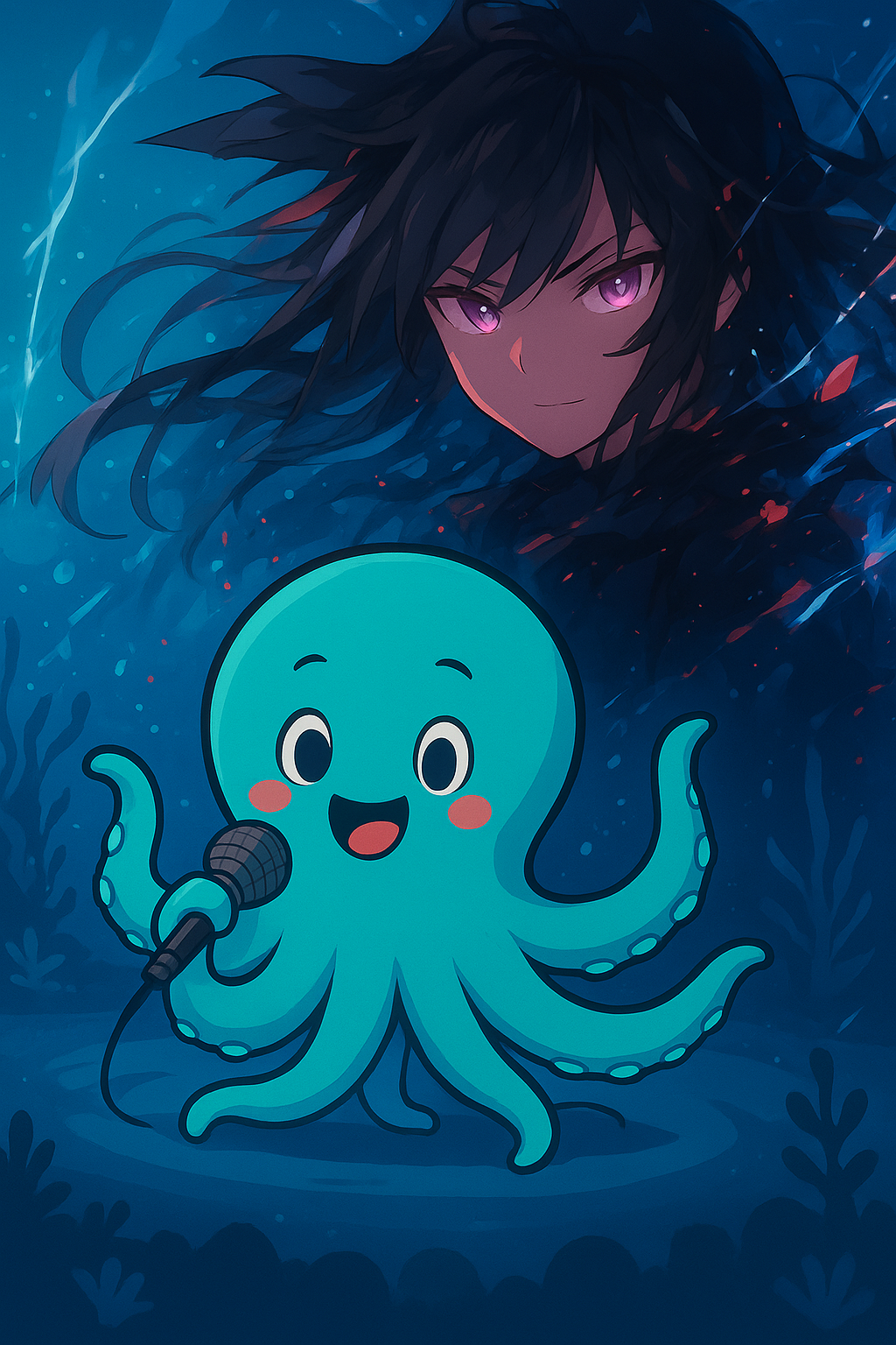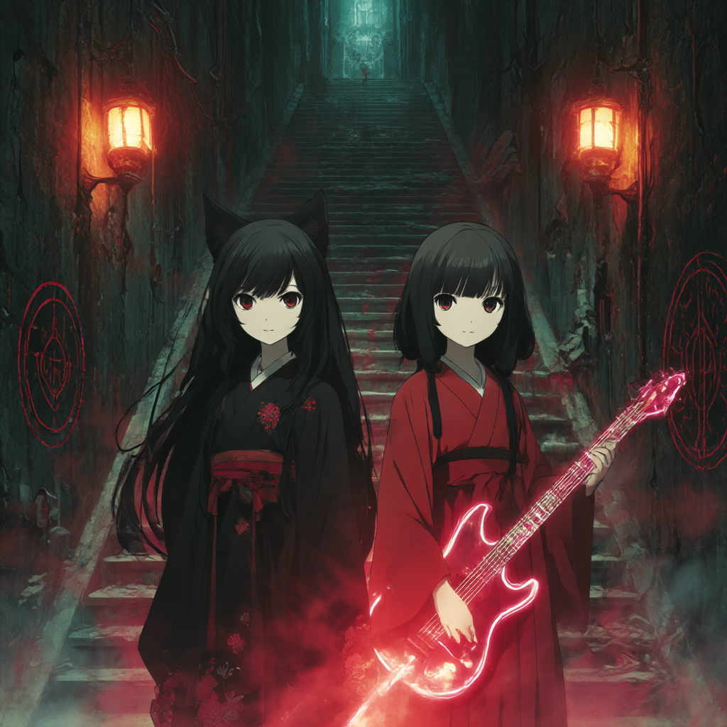 Dark electric-horror rock with Japanese folk elements, Kuro performs all A-melodies and the C-melody with a soft yet steady low-tone voice, guiding like gentle shadows in the underworld, Ichi sings each B-melody with a sharper, stronger tone fueled by her determination to save her master, In the Chorus and Final Chorus, they do not overlap—instead they alternate one phrase at a time to avoid vocal cancellation and create a haunting call-and-response through the depths of hell, Kuro’s warm shadowy tone contrasts Ichi’s bright, cutting clarity, and their alternating lines form a dramatic duality, Distorted guitars, reverb-heavy bass, reversed-breath ambience, and subtle ritual-horror textures maintain the underworld mood while preserving clear vocal separation and powerful duet contrast