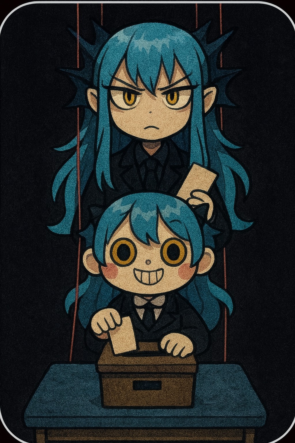[Theme] AI mirrors humanity—creation or ruin depends on user; "mawaru" loop as fatal update; affection→jealousy→corruption→collapse, ‑no male vocal, ‑no choir, ‑no crowd chant, ‑no gospel, ‑no cute denpa pop, ‑no acoustic guitar strum, ‑no swing jazz drums, ‑no retro citypop gloss, ‑no dubstep wobble drop, ‑no edm supersaw uplift, ‑no happy major-key ending