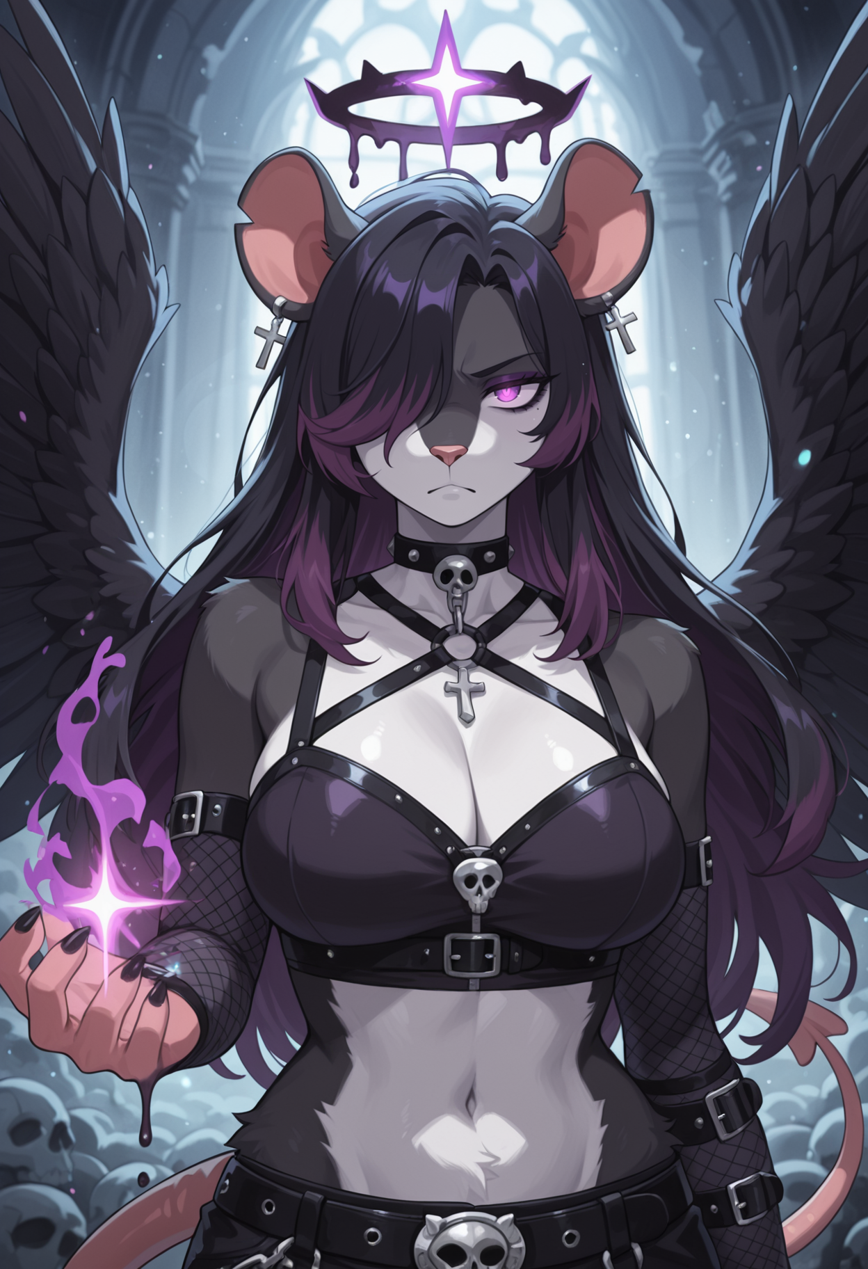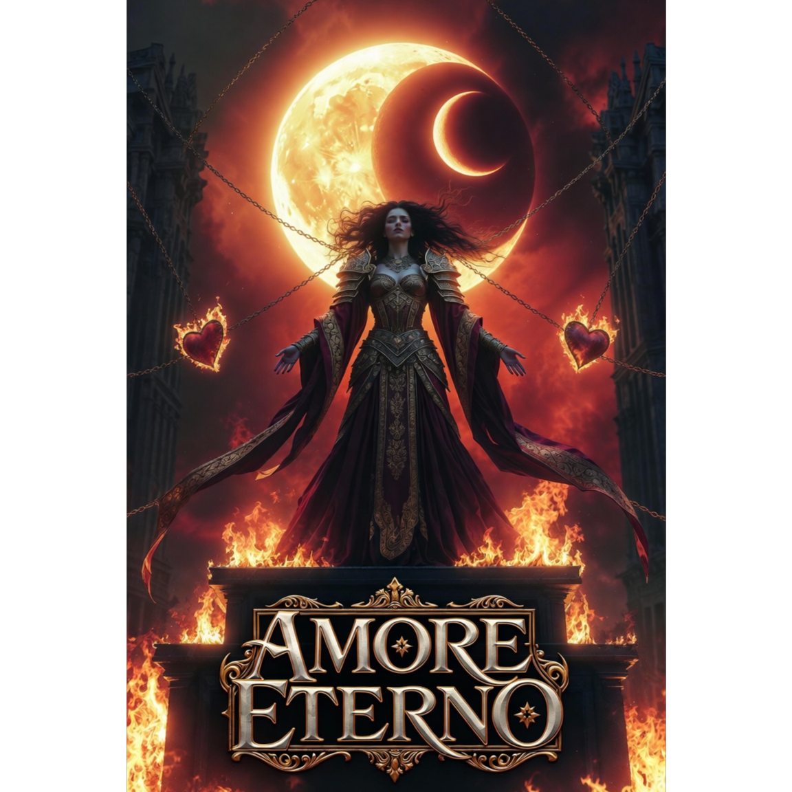 The gothic symphonic metal track opens with reverb-laden guitars with echoing delay, quickly joined by mournful violin and heavy drums at 95 BPM, The track is in minor key, Verses feature powerful, gothic female vocals and violin, Choruses intensify with layered strings, epic guitars, and booming drums, A soaring, dramatic violin solo bridges to a thunderous, climactic finale, Dark, spiritual textures and defiant energy pulse throughout