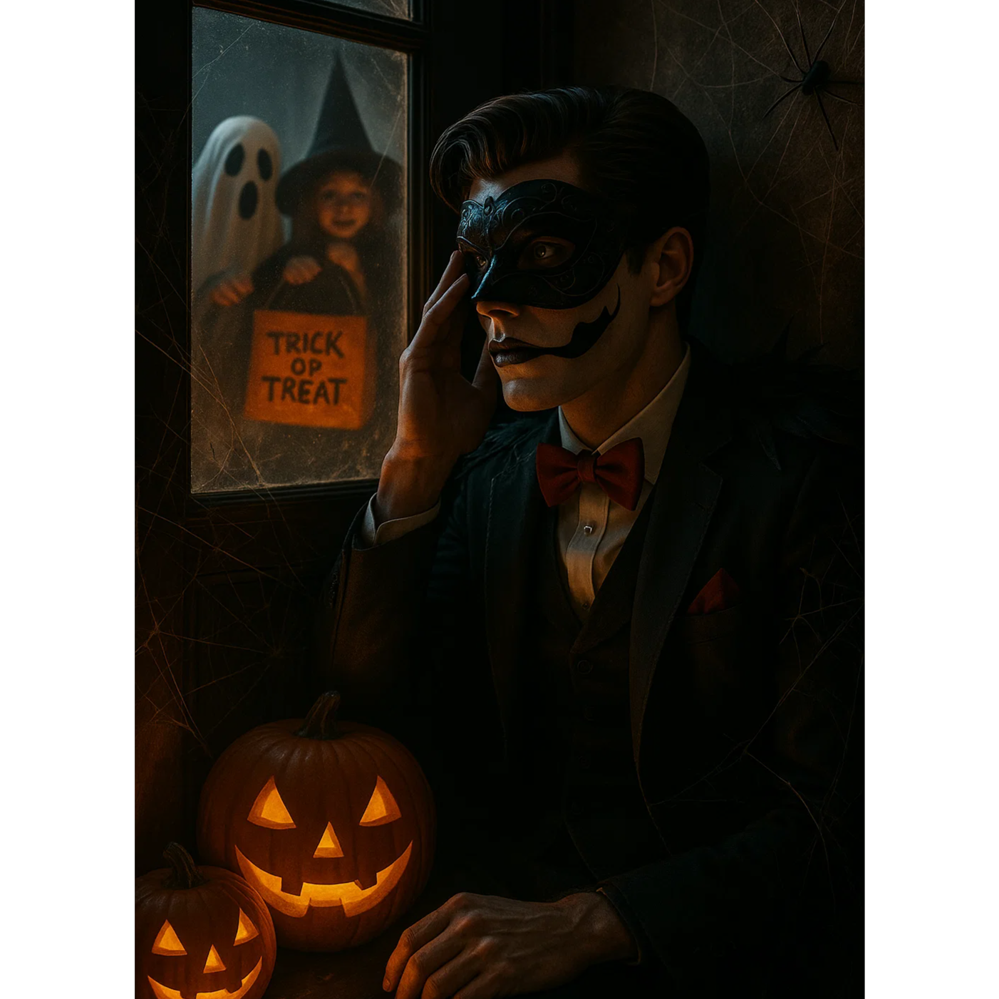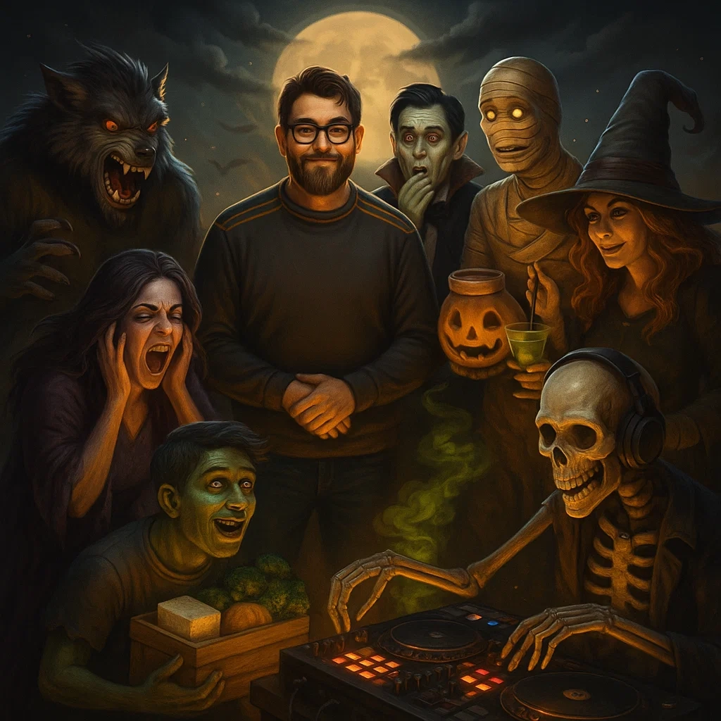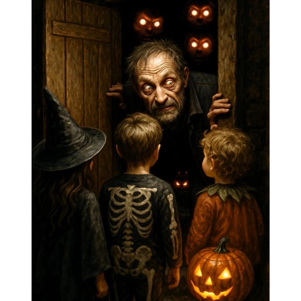 Playful Halloween Rap with spooky cartoon energy, mischievous male vocal delivery, rhythmic hip-hop beat with eerie ambience, creaking door fx, ghostly whispers, vinyl scratches and haunted house sound design, Think “Goosebumps meets Slim Shady in a trick-or-treat cypher, ” Bounce-heavy drums, upright bass or tuba stabs, creepy xylophone or theremin melodies, Occasional children choir “ooooh” and sudden BOOO! shout fx, Mix of comedy and horror – spooky but fun, like a Halloween special on late-night TV