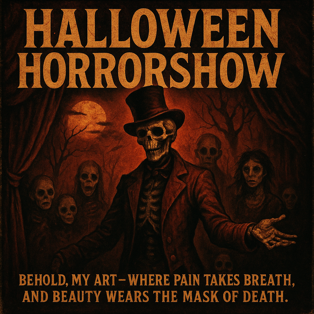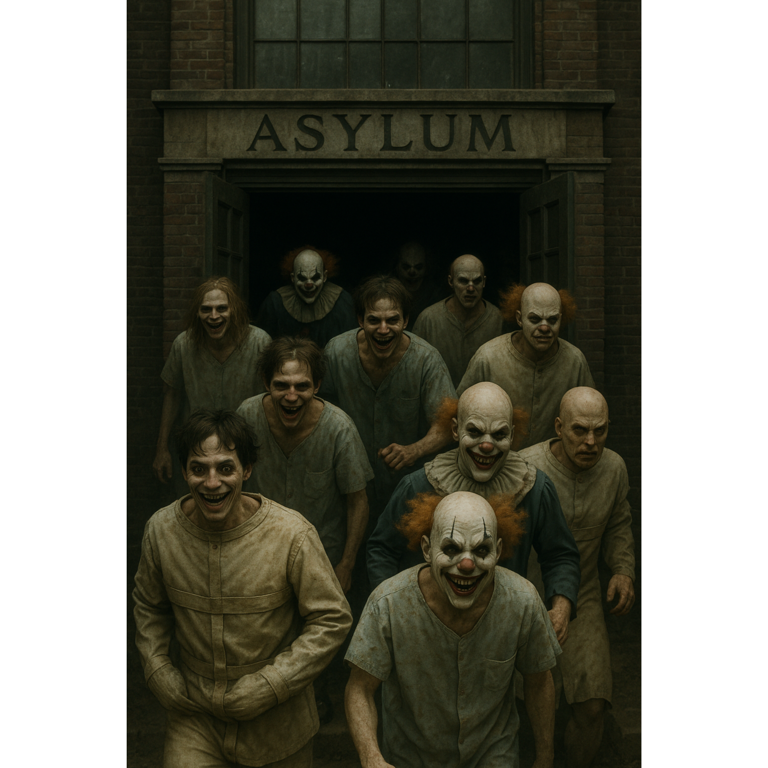 Dark theatrical horror soundtrack meets gothic carnival rock, Slow–mid tempo, haunting pipe organ and detuned music box melodies, layered with eerie whispers and children’s choir echoes, Distorted fairground sounds (creaking rides, broken calliope), heavy reverb drums, and deep, rumbling bass, Vocals: sinister, theatrical, almost whispered at times, breaking into maniacal laughter, Atmosphere: unsettling, circus-gone-wrong, with cinematic Halloween tension and a creeping, claustrophobic vibe