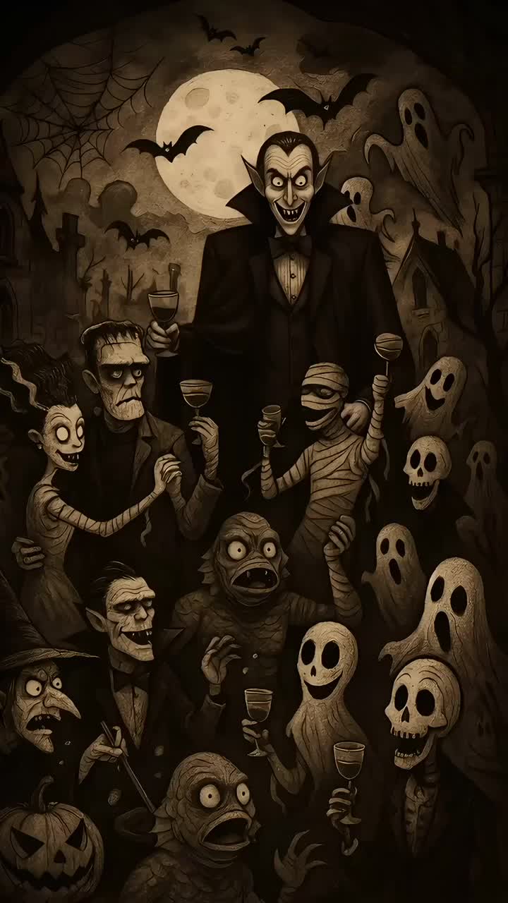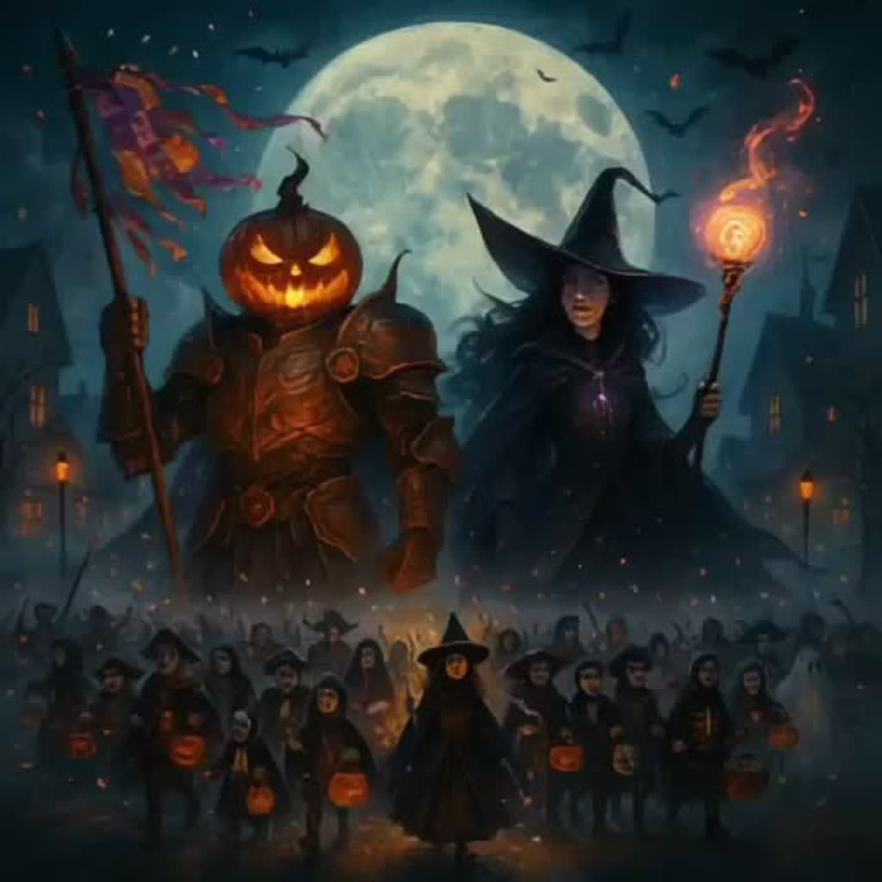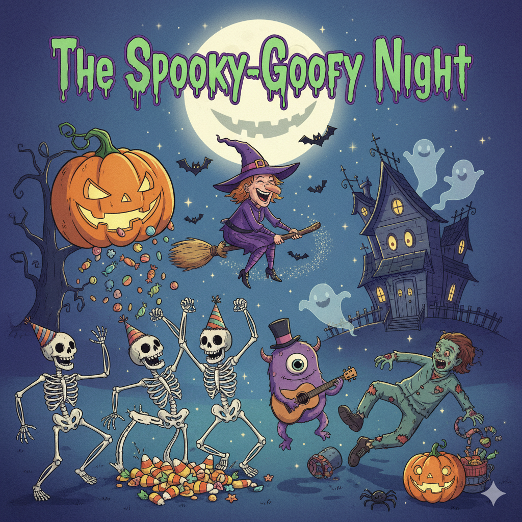 A playful, family-friendly Halloween pop tune with retro surf-rock sparkle: twangy guitars, handclap hooks, and a cheeky theremin dance around kid-safe spooky SFX, Verses bounce with tight drums and comic imagery; short pre-chorus breaks add tension; choruses open into clap-along refrains, A light breakdown and a four-bar build set up a recap-style final chorus that wraps the night with warmth before a winked hard stop—perfect for festive playlists and party sing-alongs, [Key: A minor][BPM: 128][Tags: HalloweenPop][RetroSurf][ThereminLead][CleanEdit][KidFriendly][HookClaps]