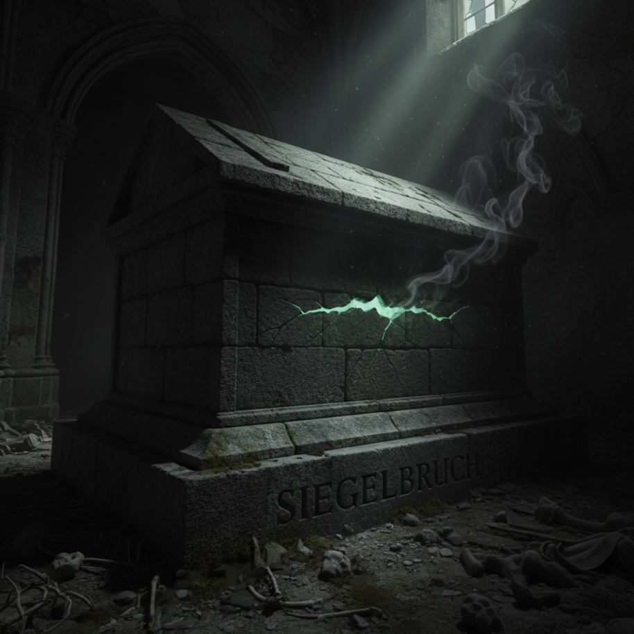 A German-language horrorcore track with a driving beat and a dark, atmospheric soundscape, The song features a male vocalist with a deep, spoken-word delivery, transitioning into a more melodic, almost rap-like style during the verses, The instrumentation includes a prominent, distorted electric guitar riff, a heavy kick drum, and a sustained, eerie synth pad, The tempo is moderate, creating a sense of urgency and dread, Production elements include reverb on the vocals and a somewhat compressed, raw mix, The song structure is verse-chorus with an instrumental break, The key is minor, contributing to the ominous mood