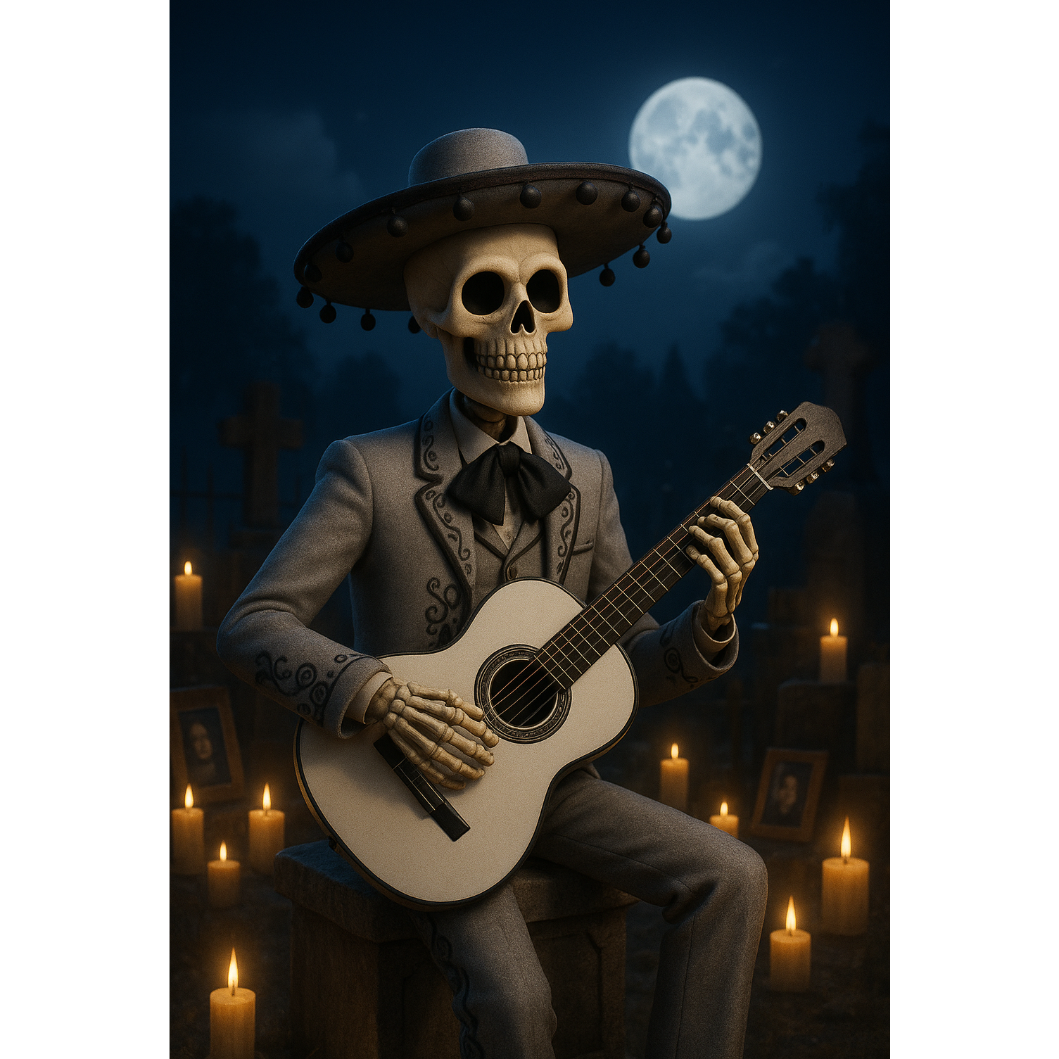 Spooky horror Halloween, mariachi rock fusion with distorted guitars, heavy reverb trumpets, haunted percussion; theatrical male voice with sorrowful, mocking, and murderous tones; recurring shouted outbursts and sinister exclamations throughout (e, g, bloodthirsty screams, ghostly laughter, vengeful shouts, dramatic threats called from the shadows)